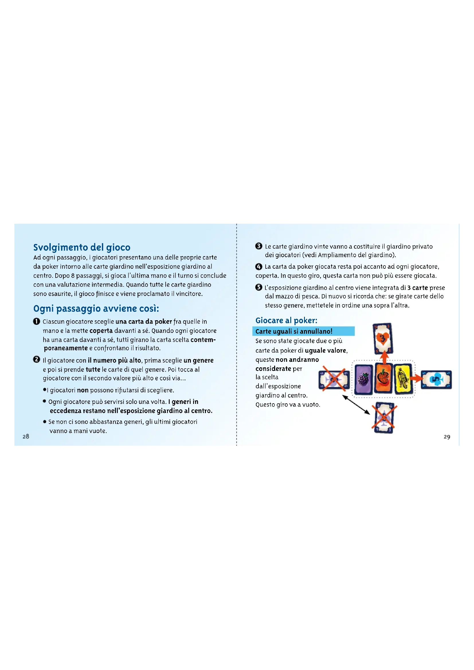 Svolgimento del gioco Ad ogni passaggio, i giocatori presentano una delle proprie carte da poker intorno alle carte giardino nell'esposizione giardino al centro. Dopo 8 passaggi, si gioca l’ultima mano e il turno si conclude con una valutazione intermedia. Quando tutte le carte giardino sono esaurite, il gioco finisce e viene proclamato il vincitore. Ogni passaggio avviene così: Ciascun giocatore sceglie una carta da poker fra quelle in mano e la mette coperta davanti a sé. Quando ogni giocatore ha una carta davanti a sé, tutti girano la carta scelta contem- poraneamente e confrontano il risultato. Il giocatore con il numero più alto, prima sceglie un genere e poi si prende tutte le carte di quel genere. Poi tocca al giocatore con il secondo valore più alto e così via... I giocatori non possono rifiutarsi di scegliere. Ogni giocatore può servirsi solo una volta. I generi in eccedenza restano nell'esposizione giardino al centro. Se non ci sono abbastanza generi, gli ultimi giocatori vanno a mani vuote. Le carte giardino vinte vanno a costituire il giardino privato dei giocatori (vedi Ampliamento del giardino). La carta da poker giocata resta poi accanto ad ogni giocatore, coperta. In questo giro, questa carta non può più essere giocata. L'esposizione giardino al centro viene integrata di 3 carte prese dal mazzo di pesca. Di nuovo si ricorda che: se girate carte dello stesso genere, mettetele in ordine una sopra l’altra. Giocare al poker: Carte uguali si annullano! Se sono state giocate due o più carte da poker di uguale valore, queste non andranno considerate per la scelta dall'esposizione giardino al centro. Questo giro va a vuoto.30