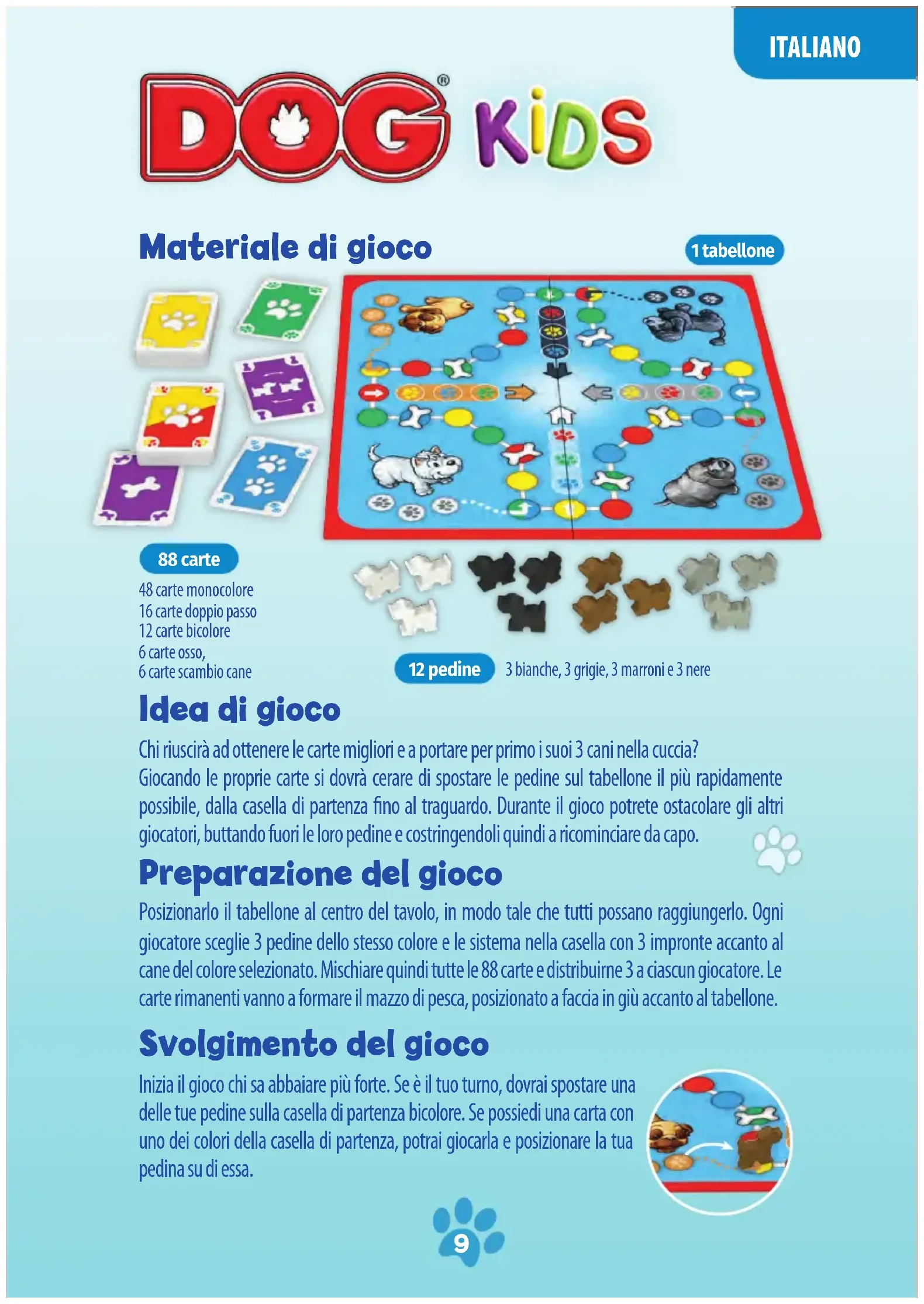 Anleitung_DOG-KIDS_KG58_DIN_A5_FINAL_29.11.2019.pdf 8 29/11/2019 12:04:27Idea di gioco Chi riuscirà ad ottenere le carte migliori e a portare per primo i suoi 3 cani nella cuccia? Giocando le proprie carte si dovrà cerare di spostare le pedine sul tabellone il più rapidamente possibile, dalla casella di partenza no al traguardo. Durante il gioco potrete ostacolare gli altri giocatori, buttando fuori le loro pedine e costringendoli quindi a ricominciare da capo. Preparazione del gioco Posizionarlo il tabellone al centro del tavolo, in modo tale che tutti possano raggiungerlo. Ogni giocatore sceglie 3 pedine dello stesso colore e le sistema nella casella con 3 impronte accanto al cane del colore selezionato. Mischiare quindi tutte le 88 carte e distribuirne 3 a ciascun giocatore. Le carte rimanenti vanno a formare il mazzo di pesca, posizionato a faccia in giù accanto al tabellone. Svolgimento del gioco Inizia il gioco chi sa abbaiare più forte. Se è il tuo turno, dovrai spostare una delle tue pedine sulla casella di partenza bicolore. Se possiedi una carta con uno dei colori della casella di partenza, potrai giocarla e posizionare la tua pedina su di essa. ITALIANO