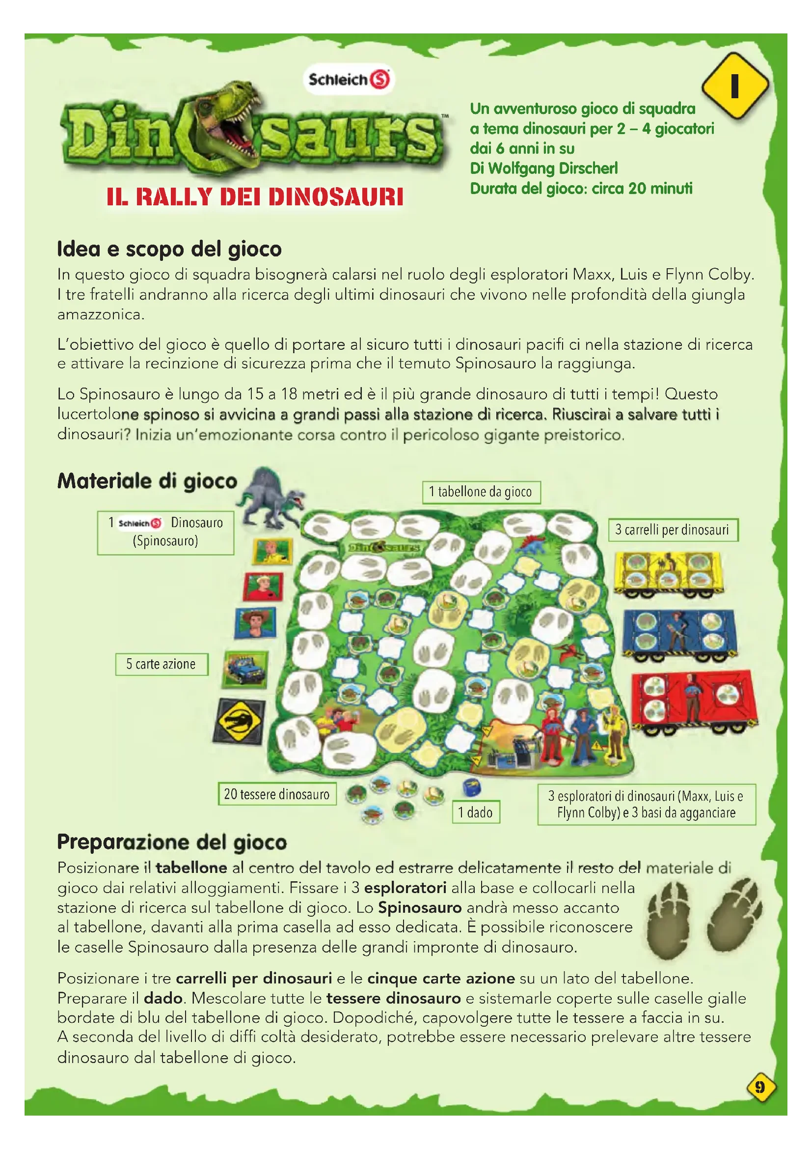 Un avventuroso gioco di squadra a tema dinosauri per 2 – 4 giocatori dai 6 anni in su Di Wolfgang Dirscherl Durata del gioco: circa 20 minuti10 Prima dell’inizio del gioco, concordare un livello di diffi coltà. Consigliamo di iniziare con il livello di esploratori in erba: ➜ Livello di gioco per esploratori in erba: Prelevare le sei tessere su cui sono raffi - gurate delle uova di dinosauro (non importa quante). Questi dinosauri si trovano già al sicuro all’interno della stazione di ricerca! ➜ Livello di gioco per esploratori avanzati: Prelevare le tre tessere su cui sono raffi gurate due uova di dinosauro. Questi tre dinosauri sono già al sicuro. ➜ Livello di gioco per esploratori esperti: I giocatori esperti giocano con tutte le tessere dinosauro. Questa volta sarà molto diffi cile! Svolgimento del gioco Sta per avere inizio la grande avventura dei dinosauri: L’obiettivo della squadra è quello di portare tutti i dinosauri sulla mappa e i tre fratelli Colby al sicuro prima che lo Spinosauro raggiunga la stazione di ricerca. Nota: Potete consultarvi a vicenda prima di ogni turno, ma il giocatore attivo dovrà compiere l’azione da solo! Il gioco si svolge a turni in senso orario. Inizia il giocatore più giovane che lancia il dado. Se dal lancio ottiene lo Spinosauro, dovrà far avanzare il dinosauro di una casella sul percorso contrassegnato dalle impronte. Se dal lancio del dado ottiene un numero (1– 5), dovrà scegliere una delle carte azione scoperte e far avanzare il personaggio prescelto del numero di caselle corrispondenti sul tabellone. Infi ne, dovrà capovolgere la carta azione utilizzata a faccia in giù. È possibile scegliere tra queste carte azione: Maxx, Luis, Flynn: Spostare il rispettivo esploratore sulle caselle bordate di blu in qualsiasi direzione sul tabellone di gioco. Importante: spostando l’esploratore, è possibile rinunciare ad alcuni punti del dado. Se dal lancio del dado si ottiene un 3, è possibile avanzare solo di una o due caselle oppure rinunciare completamente alla mossa (ad esempio verso fi ne partita)! Non si può cambiare dire- zione durante una mossa. Esploratore jolly: In questo caso è possibile scegliere liberamente tra Maxx, Luis e Flynn. Far avanzare l’esploratore selezionato. Naturalmente, con il jolly è possibile rinunciare ad alcuni punti del dado! Maxx Luis Flynn11 Spinosauro: Far avanzare lo Spinosauro per il numero di caselle corrispondente al risultato del lancio del dado. Suggerimento: Non aspettare troppo a lungo per estrarre il dinosauro. Se resta scoperta solo la carta azione Spinosauro, occorre utilizzare il numero corrispondente al lancio del dado per lo Spinosauro! Importante: È possibile scegliere solo tra le carte azione ancora scoperte. Una volta utilizzate tutte le carte azione e dopo averle coperte, voltare cinque carte contemporaneamente. In questo modo il giocatore successivo potrà selezionare delle nuove carte tra le cinque a disposizione! Le tessere dinosauro possono essere collezionate nel seguente modo: Se un esploratore giunge su una casella del tabellone con una tessera dinosauro, potrà raccoglierla e posizionarla nel proprio carrello. Nel collezionare i dinosauri, bisogna considerare alcune caratteristiche di ciascun esploratore: Maxx: Maxx può raccogliere due Triceratopi e due Brachiosauri allo stesso tempo. Pertanto, può collezionare fi no a quattro tessere dinosauro e portarle alla stazione di ricerca. Luis: Luis può raccogliere contemporaneamente due tessere Triceratopo e tre Stegosauro. Pertanto, può collezionare fi no a cinque tessere dinosauro e portarle alla stazione di ricerca. Flynn: Flynn è molto fl essibile. Può raccogliere tre gettoni dinosauro qualsiasi e portarli alla stazione di ricerca. Ecco come portare i dinosauri al sicuro nella stazione di ricerca: Una volta riempiti i carrelli per dinosauri, bisogna aiutare Maxx, Luis o Flynn a portare i dinosauri alla stazione di ricerca per salvarne altri. Ad ogni modo, è possibile condurre gli esploratori alla stazione in qualsiasi momento, anche se non sono stati riempiti tutti gli spazi del carrello. A tal fi ne occorre tornare di corsa alla stazione di ricerca con il rispettivo esploratore. Una volta raggiunta la stazione di ricerca con uno dei fratelli Colby, estrarre le tessere dal carrello e posizionarle al suo interno. Adesso, questi dinosauri sono al sicuro dagli Spinosauri. Al turno successivo, l’esploratore potrà tornare indietro e raccogliere altri dinosauri!12 Altre regole: ➜ È possibile che più esploratori di dinosauri sostino su una stessa casella contemporaneamente. ➜ Un esploratore può raccogliere più tessere dinosauro in un solo turno, purché ci sia abbastanza spazio nel carrello. ➜ Una volta raccolte, le tessere dinosauro non possono essere scambiate tra gli esploratori o rimesse sul tabellone di gioco. ➜ Non è possibile spostare un esploratore su una casella dove si trova attualmente lo Spinosauro! ➜ Se lo Spinosauro giunge su una casella del tabellone con una tessera dinosauro o un esploratore, la partita termina immediatamente. Fine del gioco Si vince la partita insieme se si riesce a portare tutti i dinosauri insieme agli esploratori alla stazione di ricer- ca. Gli esploratori attivano rapidamente la recinzione di sicurezza e lo Spinosauro non ha più la possibilità di entrare nella stazione di ricerca. Ottimo lavoro! Siete davvero dei fantastici esploratori di dinosauri! La partita viene persa se lo Spinosauro raggiunge la stazione di ricerca senza prima aver portato in salvo tutti i dinosauri e gli esploratori. Purtroppo questa volta hai avuto sfortuna, ma puoi riprovarci. Attenzione: La partita si conclude con la sconfi tta anche se lo Spinosauro giunge in una casella occupata da un esploratore o da una tessera dinosauro! Variante di gioco per esploratori avanzati In questa variante di gioco, l’esploratore di dinosauri deve rimanere sulla casella del tabellone in cui desidera r