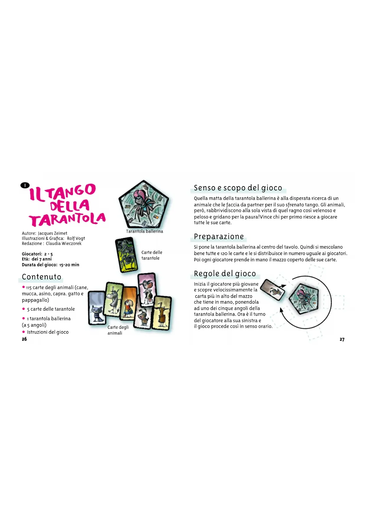 Istruzioni del gioco Senso e scopo del gioco Quella matta della tarantola ballerina è alla disperata ricerca di un animale che le faccia da partner per il suo sfrenato tango. Gli animali, però, rabbrividiscono alla sola vista di quel ragno così velenoso e peloso e gridano per la paura!Vince chi per primo riesce a giocare tutte le sue carte. Preparazione Si pone la tarantola ballerina al centro del tavolo. Quindi si mescolano bene tutte e 120 le carte e le si distribuisce in numero uguale ai giocatori. Poi ogni giocatore prende in mano il mazzo coperto delle sue carte. Regole del gioco Inizia il giocatore più giovane e scopre velocissimamente la carta più in alto del mazzo che tiene in mano, ponendola ad uno dei cinque angoli della tarantola ballerina. Ora è il turno del giocatore alla sua sinistra e il gioco procede così in senso orario. Carte degli animali Carte delle tarantole Tarantola ballerina28