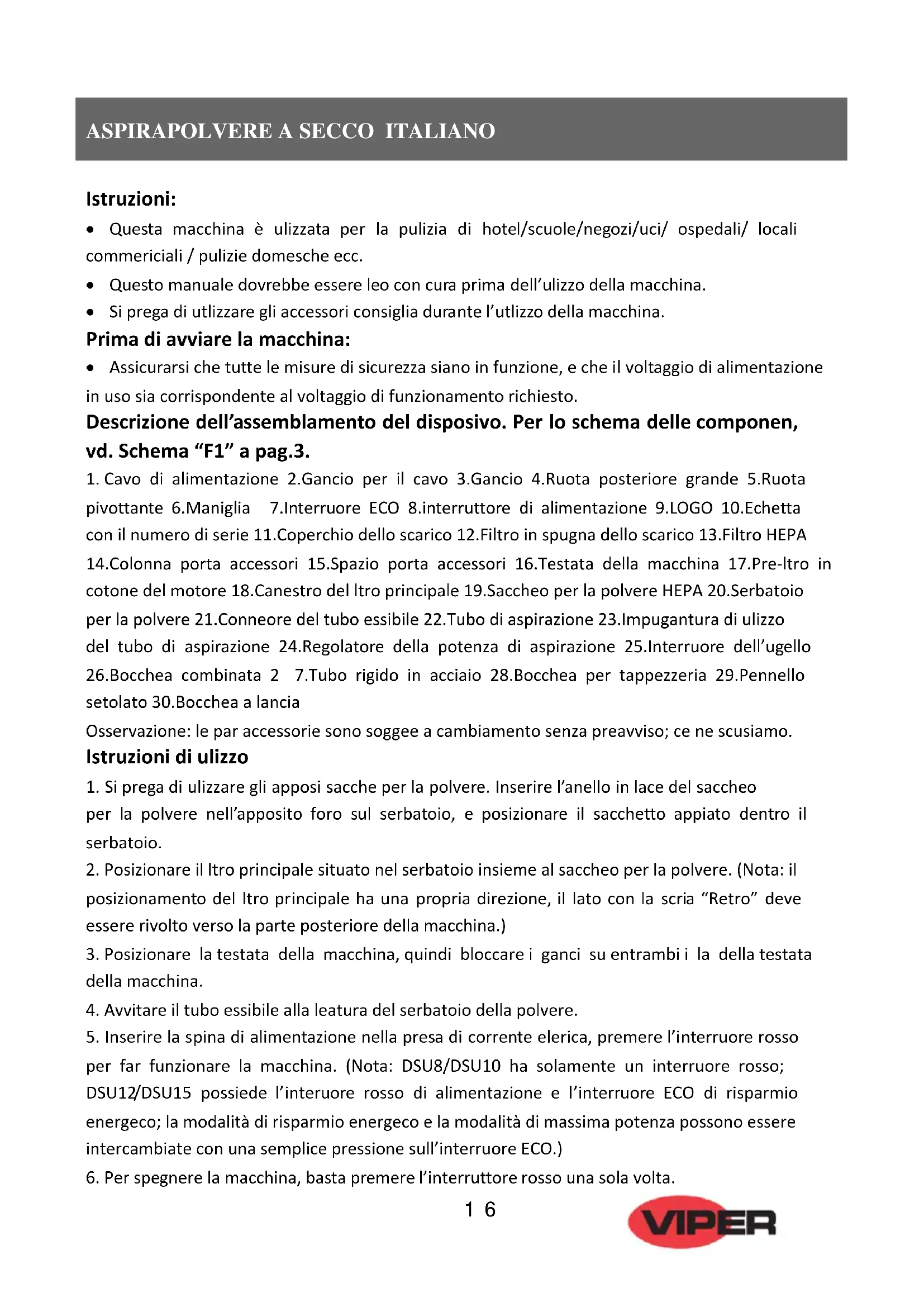 Istruzioni: Questa macchina è utilizzata per la pulizia di hotel/scuole/negozi/uffici/ ospedali/ locali commericiali / pulizie domestiche ecc. Questo manuale dovrebbe essere letto con cura prima dell’utilizzo della macchina. Si prega di utlizzare gli accessori consigliati durante l’utlizzo della macchina. Prima di avviare la macchina: Assicurarsi che tutte le misure di sicurezza siano in funzione, e che il voltaggio di alimentazione in uso sia corrispondente al voltaggio di funzionamento richiesto. Descrizione dell’assemblamento del dispositivo. Per lo schema delle componenti, vd. Schema “F1” a pag.3.
