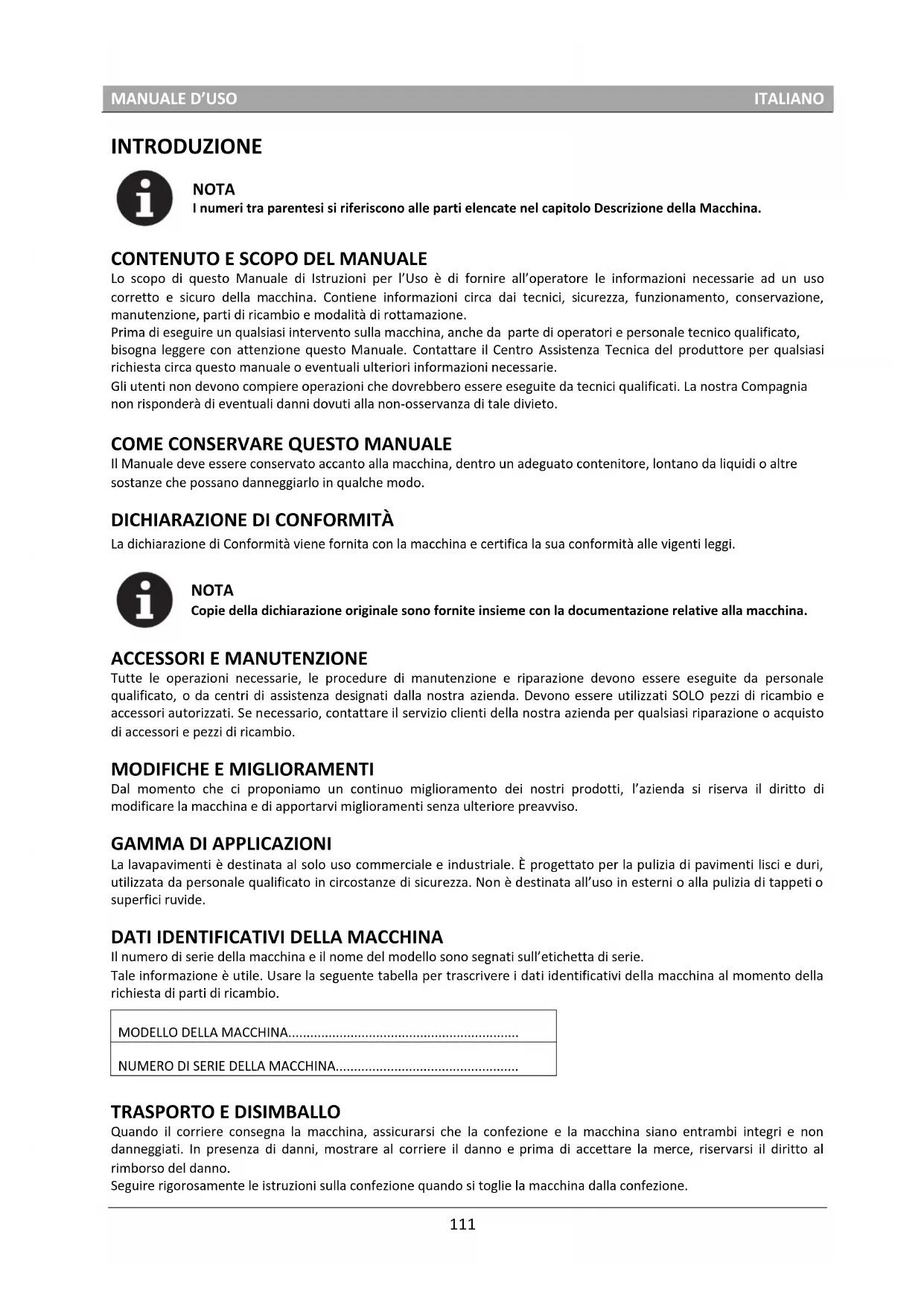 ITALIANO Verificare con attenzione la macchina prima di ogni utilizzo. Assicurarsi che tutti I componenti siano correttamente fissati prima dell’uso. Altrimenti si potrebbero causare danni a persone e cose. Prima di usare il caricabatteria, assicurarsi che I valori di frequenza e di voltaggio indicati sull’etichetta del numero di serie della macchina coincidano con quelli dell’alimentazione. Non spostare mai la macchina tirando il cavo del caricatore della batteria. Non far passare il cavo attraverso porte chiuse, o sopra bordi e spigoli taglienti. Non far passare la macchina sopra il cavo di ricarica della batteria. Tenere il cavo di ricarica della batteria lontano da superfici riscaldate. Non caricare le batterie se il cavo di ricarica o la spina sono danneggiati. Per ridurre il rischio di incendio, scosse elettriche o lesioni, assicurarsi che la macchina sia spenta prima di andarsene. Usare o riporre la macchina in un ambiente interno in condizioni asciutte; la macchina non è progettata per uso in esterni. La temperatura sia di lavoro che di conservazione della macchina deve essere compresa tra 0 °C e +40 °C, l’umidità dell’aria deve essere compresa tra il 30% - 95%. Non usare la macchina su pendii con una pendenza superiore alle specifiche indicate. Nell’utilizzare detergenti per pavimenti, seguire le istruzioni sull’etichetta della bottiglia del detergente e indossare apposite guanti di protezione. Usare spazzole e pad forniti con la macchina o indicate nel manuale. L’utilizzo di altre spazzole o di pad diversi potrebbe ridurre la sicurezza. In caso di malfunzionamento della macchina, assicurarsi che ciò non sia dovuto a mancanza di manutenzione. Se necessario, richiedere assistenza a personale autorizzato presso il Servizio di Assistenza Clienti. Prendere tutte le precauzioni necessarie per evitare che capelli, gioielli o parti di vestiario restino impigliati nelle parti mobili della macchina. Non usare la macchina in aree particolarmente polverose. Non lavare la macchina con getti d’acqua diretti o pressurizzati o con sostanze corrosive. Non urtare scaffali o mensole, specie dove ci sia il rischio di caduta di oggetti. Non appoggiare contenitori di liquidi sulla macchina, bensì usare lo specifico porta-contenitori. Per evitare di danneggiare il pavimento, non permettere che le spazzole/il disco trascinatore siano in funzione a macchina immobile. In caso di incendio, utilizzare un estintore a polvere. Non usare estintori liquidi. Non rimuovere o modificare gli adesivi sulla macchina. Non alterare I dispositivi di sicurezza della macchina e seguire le indicazioni di manutenzione ordinaria scrupolosamente. Fare attenzione durante il trasporto della macchina quando la temperatura è al di sotto del punto di congelamento. L’acqua nel serbatoio di raccolta e nei tubi potrebbe congelare e causare seri problemi alla macchina. Se alcuni componenti necessitano di essere sostituiti, ordinare ricambi ORIGINALI presso Fornitori o Rivenditori Autorizzati. Riportare la macchina presso il Centro di Assistenza se non funziona come al solito o se è in condizioni per cui abbia subito danni, sia rimasta all’aperto o sia caduta in acqua. Per garantire un funzionamento appropriato e sicuro della macchina, la manutenzione programmata indicata nell’apposito capitolo di questo Manuale deve essere puntualmente eseguita da personale o da un Centro di Assistenza Clienti autorizzati. La macchina deve essere smaltita correttamente, per la presenza di materiali tossici-dannosi (batterie, ecc.) che sono soggetti ad apposita normativa e che richiedono lo smaltimento in Centri specializzati (vd. capitolo sullo Smaltimento). Questa macchina è solo uno strumento di pulizia e non deve esser utilizzata ad alcun altro scopo. Tenere sempre le fessure libere da polvere, capelli e ogni altro materiale estraneo che potrebbe ridurre il flusso d’aria. Non usare la macchina se le aperture di ventilazione sono ostruite. Usare la macchina solo dove sia disponibile un’opportuna illuminazione. La macchina non è progettata per essere utilizzata da persone con ridotte funzioni fisiche, sensoriali o mentali, o che manchino di esperienza e conoscenza, a meno che non vengano garantite supervisione o istruzioni da parte di una persona responsabile della loro sicurezza. Porre estrema attenzione quando la si usa vicino ai bambini. I bambini dovrebbero essere supervisionati per assicurarsi che non giochino con la macchina. Mentre si usa la macchina, assicurarsi di non causare danni a persone o oggetti.