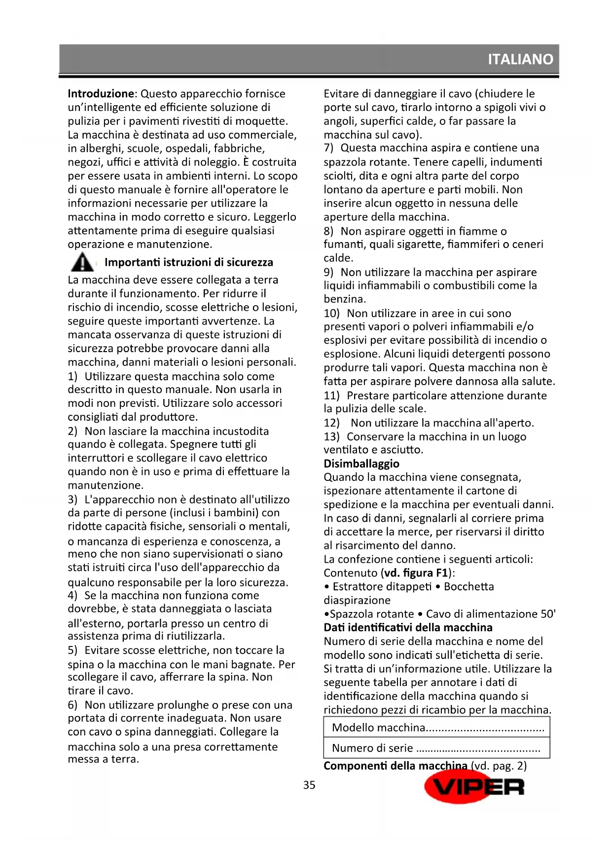 Introduzione: Questo apparecchio fornisce un’intelligente ed efficiente soluzione di pulizia per i pavimenti rivestiti di moquette. La macchina è destinata ad uso commerciale, in alberghi, scuole, ospedali, fabbriche, negozi, uffici e attività di noleggio. È costruita per essere usata in ambienti interni. Lo scopo di questo manuale è fornire all'operatore le informazioni necessarie per utilizzare la macchina in modo corretto e sicuro. Leggerlo attentamente prima di eseguire qualsiasi operazione e manutenzione.