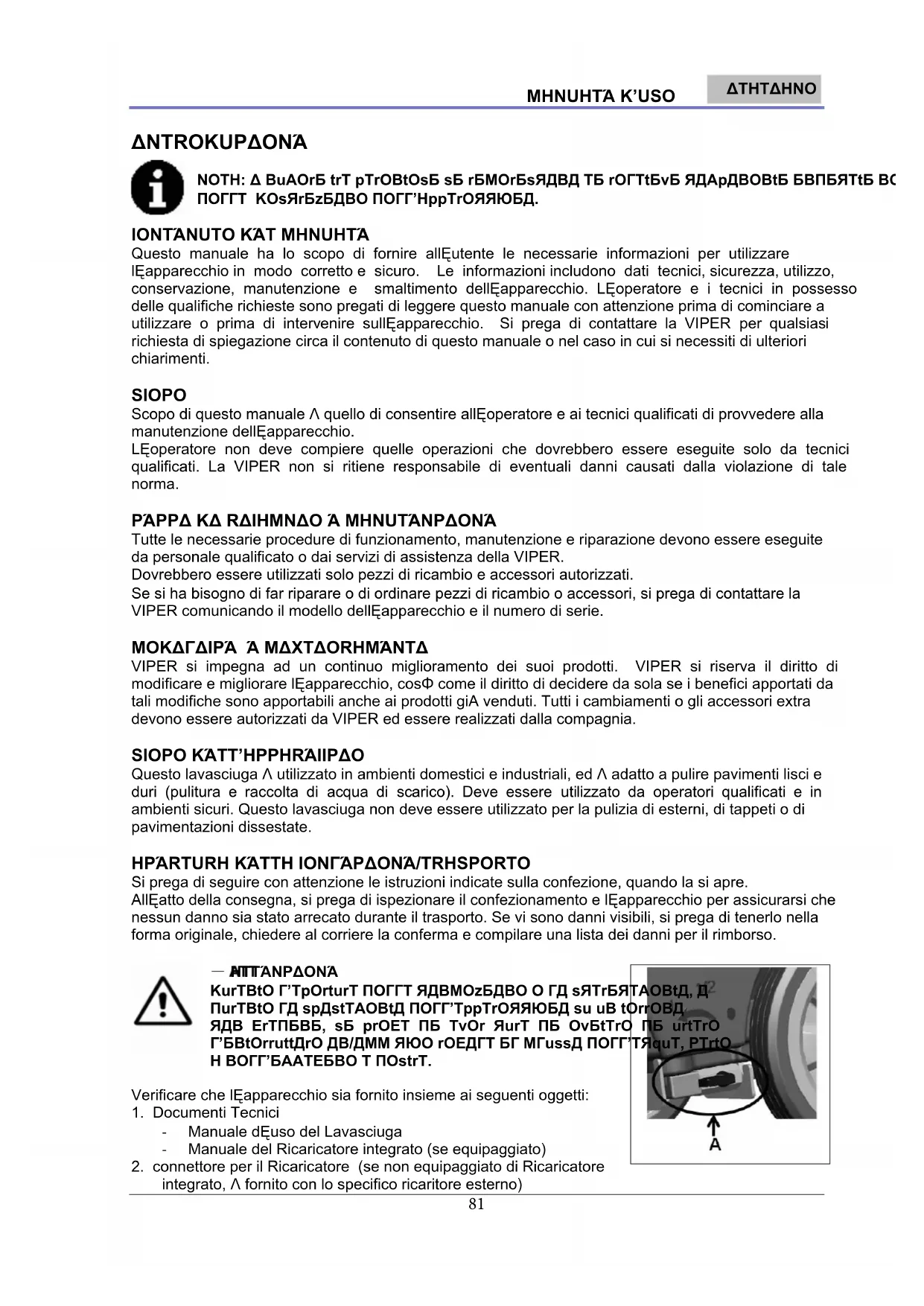 Questo manuale ha lo scopo di fornire all’utente le necessarie informazioni per utilizzare l’apparecchio in modo corretto e sicuro. Le informazioni includono dati tecnici, sicurezza, utilizzo, conservazione, manutenzione e smaltimento dell’apparecchio. L’operatore e i tecnici in possesso delle qualifiche richieste sono pregati di leggere questo manuale con attenzione prima di cominciare a utilizzare o prima di intervenire sull’apparecchio. Si prega di contattare la VIPER per qualsiasi richiesta di spiegazione circa il contenuto di questo manuale o nel caso in cui si necessiti di ulteriori chiarimenti. SCOPO Scopo di questo manuale è quello di consentire all’operatore e ai tecnici qualificati di provvedere alla manutenzione dell’apparecchio. L’operatore non deve compiere quelle operazioni che dovrebbero essere eseguite solo da tecnici qualificati. La VIPER non si ritiene responsabile di eventuali danni causati dalla violazione di tale norma.