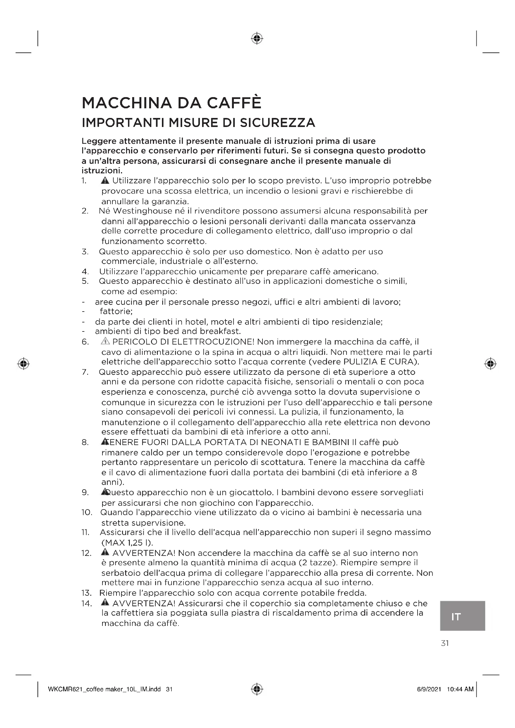 In caso di dubbi o domande in merito al prodotto, visitare il sito web: www. westinghousehomeware.com, oppure contattare gli uffici/agenti esteri. In linea con la nostra politica di continuo sviluppo del prodotto, ci riserviamo il diritto di modificare le specifiche del prodotto, dell’imballaggio e della documentazione senza preavviso. SPECIFICHE Modello Tensione Potenza Capacità WKCMR621RD WKCMR621BK WKCMR621WH 220-240V~, 50-60Hz 1000W 1.25L / 10 tazze WKCMR621_coffee maker_10L_IM.indd 37WKCMR621_coffee maker_10L_IM.indd 37 6/9/2021 10:44 AM6/9/2021 10:44 AM38