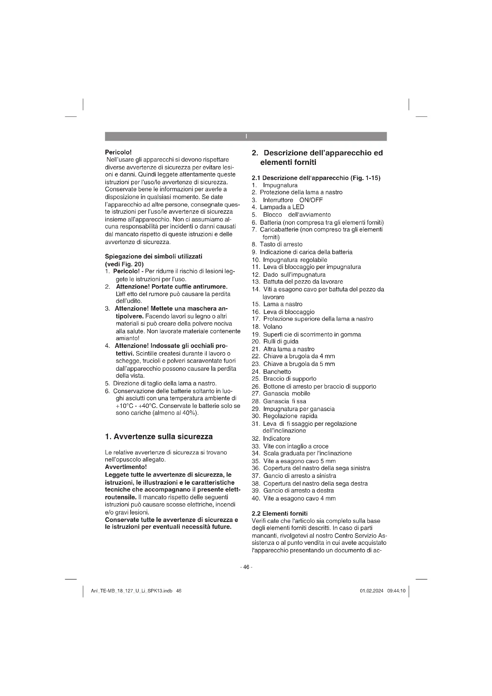Verifi cate che l‘articolo sia completo sulla base degli elementi forniti descritti. In caso di parti mancanti, rivolgetevi al nostro Centro Servizio As- sistenza o al punto vendita in cui avete acquistato l‘apparecchio presentando un documento di ac- Anl_TE-MB_18_127_U_Li_SPK13.indb 46Anl_TE-MB_18_127_U_Li_SPK13.indb 46 01.02.2024 09:44:1001.02.2024 09:44:10I