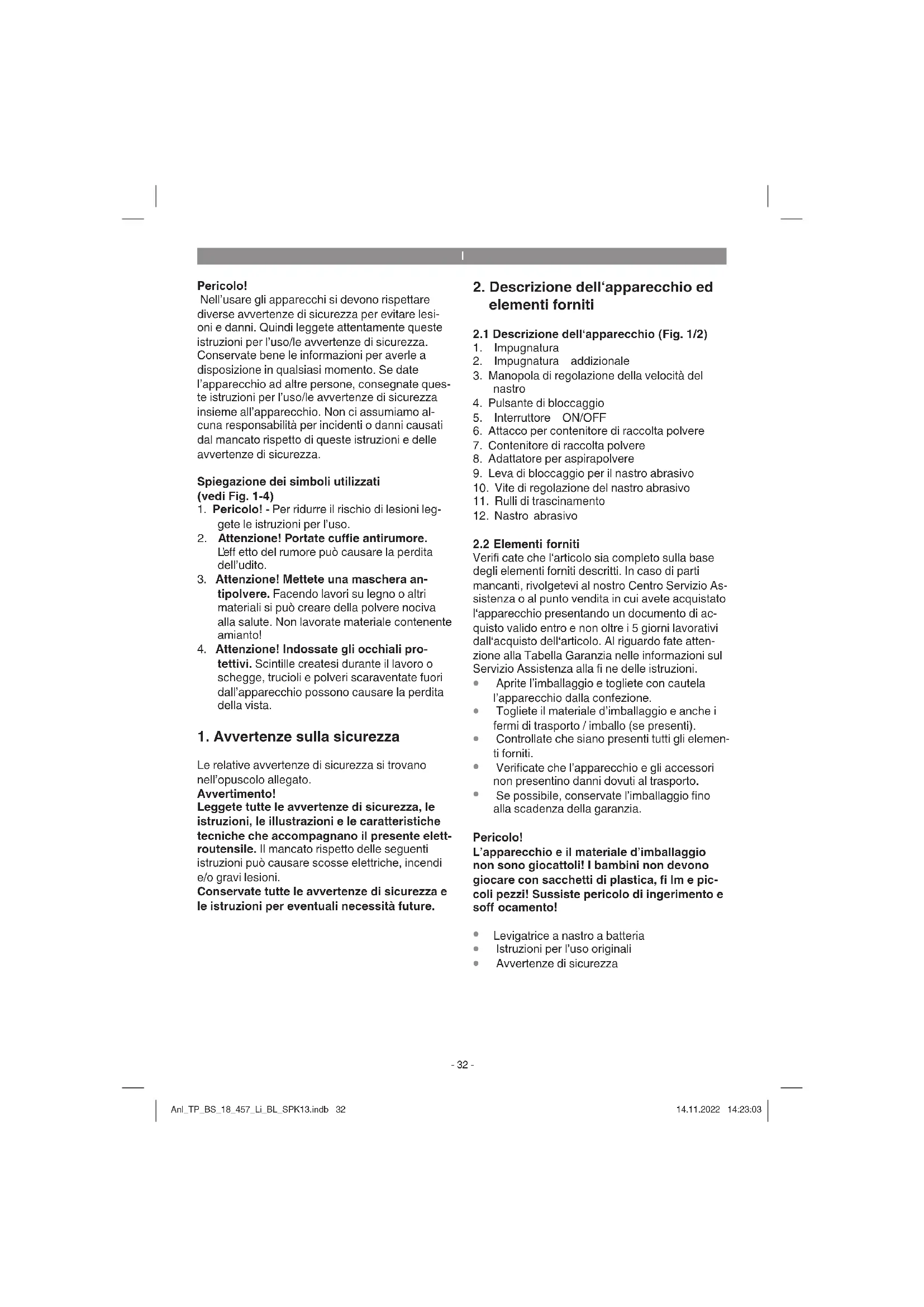 Le relative avvertenze di sicurezza si trovano nell’opuscolo allegato. Avvertimento! Leggete tutte le avvertenze di sicurezza, le istruzioni, le illustrazioni e le caratteristiche tecniche che accompagnano il presente elett- routensile. Il mancato rispetto delle seguenti istruzioni può causare scosse elettriche, incendi e/o gravi lesioni. Conservate tutte le avvertenze di sicurezza e le istruzioni per eventuali necessità future.
