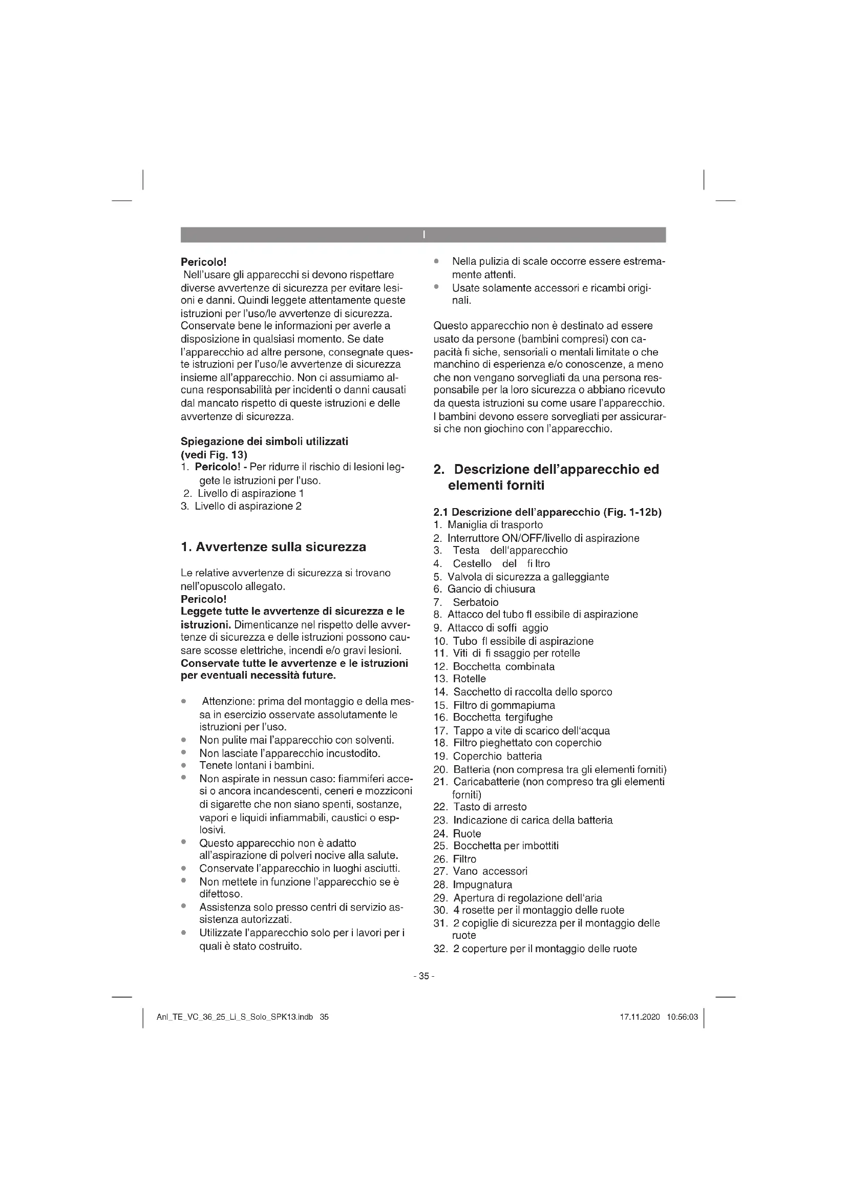e la batteria al nostro servizio di assistenza clienti. Per un invio corretto contattate il nostro ser- vizio di assistenza clienti o il punto vendita dove avete acquistato l’apparecchio. Nel caso di invio o smaltimento di batterie ovvero di apparecchi a batteria metteteli in sacchetti di plastica separati per evitare cor- tocircuiti e incendi! Per ottenere una lunga durata della batteria si deve provvedere a una puntuale ricarica. Ciò è comunque necessario quando ci si accorge della diminuzione delle prestazioni dell‘apparecchio. Non fate scaricare mai completamente la batteria. Questo potrebbe danneggiarla! Anl_TE_VC_36_25_Li_S_Solo_SPK13.indb 37Anl_TE_VC_36_25_Li_S_Solo_SPK13.indb 37 17.11.2020 10:56:0417.11.2020 10:56:04I