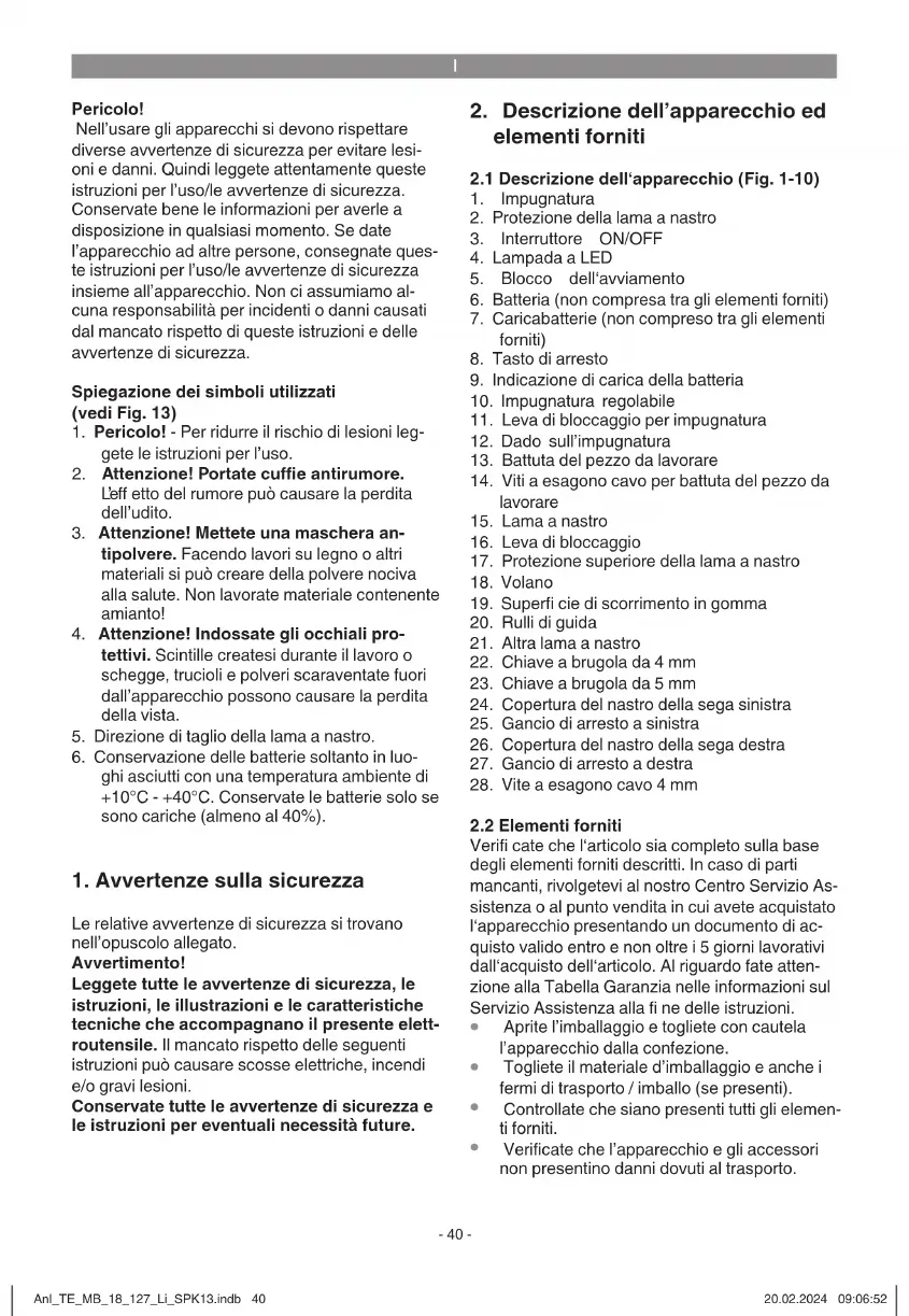Avvertenza! Prima del primo impiego si deve eseguire il rodaggio del nastro della sega. Accendete l’apparecchio solo brevemente e Anl_TE_MB_18_127_Li_SPK13.indb 43Anl_TE_MB_18_127_Li_SPK13.indb 43 20.02.2024 09:06:5320.02.2024 09:06:53I