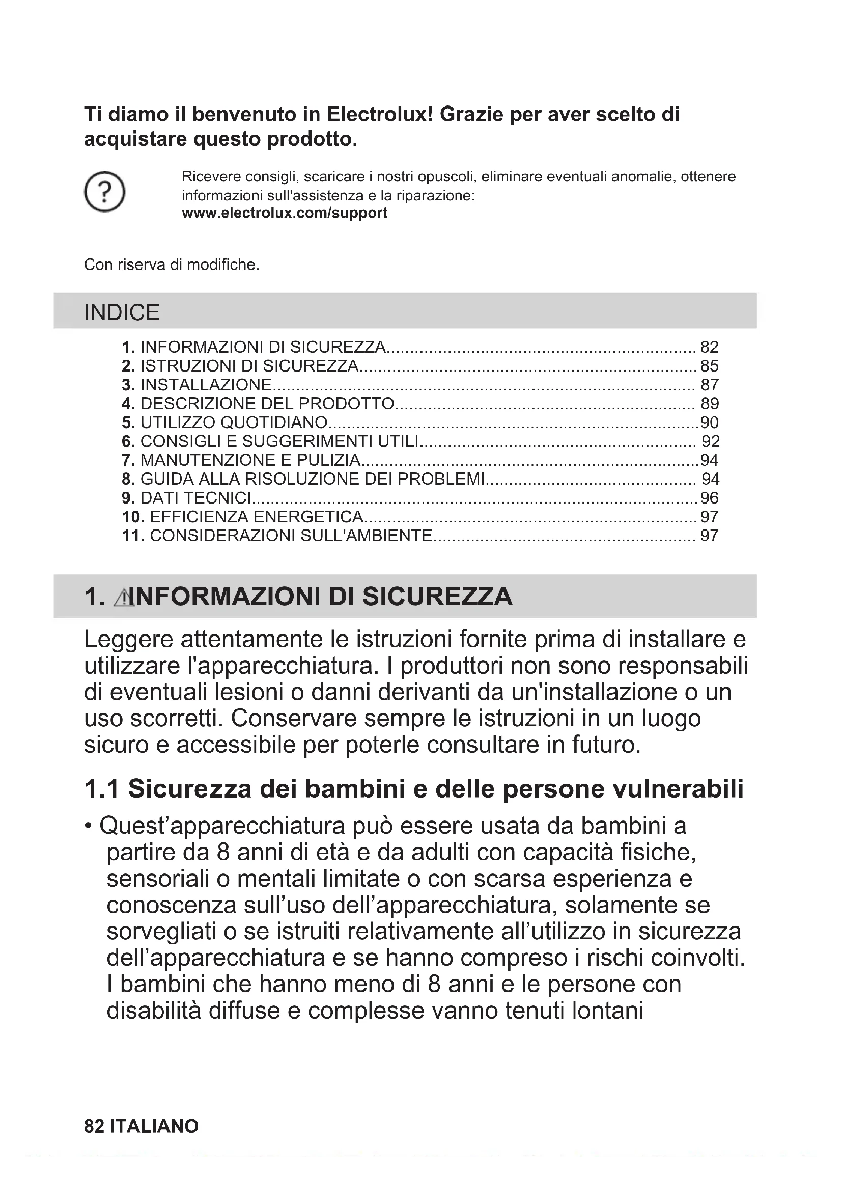 - Quest’apparecchiatura può essere usata da bambini a partire da 8 anni di età e da adulti con capacità fisiche, sensoriali o mentali limitate o con scarsa esperienza e conoscenza sull’uso dell’apparecchiatura, solamente se sorvegliati o se istruiti relativamente all’utilizzo in sicurezza dell’apparecchiatura e se hanno compreso i rischi coinvolti. I bambini che hanno meno di 8 anni e le persone con disabilità diffuse e complesse vanno tenuti lontani 82 ITALIANOdall’elettrodomestico, a meno che non vi sia una supervisione continua.
