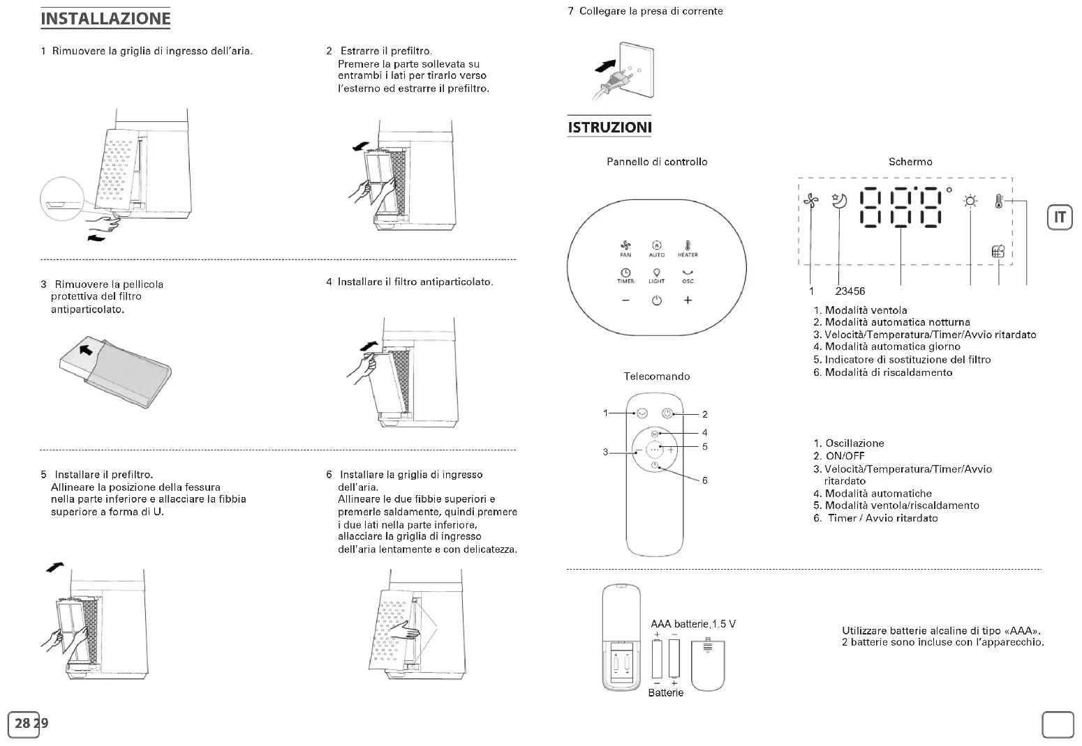 INSTALLAZIONE 1 Rimuovere la griglia di ingresso dell’aria. 3 Rimuovere la pellicola protettiva del filtro antiparticolato. 5 Installare il prefiltro. Allineare la posizione della fessura nella parte inferiore e allacciare la fibbia superiore a forma di U. 6 Installare la griglia di ingresso dell’aria. Allineare le due fibbie superiori e premerle saldamente, quindi premere i due lati nella parte inferiore, allacciare la griglia di ingresso dell’aria lentamente e con delicatezza. 4 Installare il filtro antiparticolato. 2 Estrarre il prefiltro. Premere la parte sollevata su entrambi i lati per tirarlo verso l’esterno ed estrarre il prefiltro. 7 Collegare la presa di corrente ISTRUZIONI Pannello di controllo Telecomando Schermo