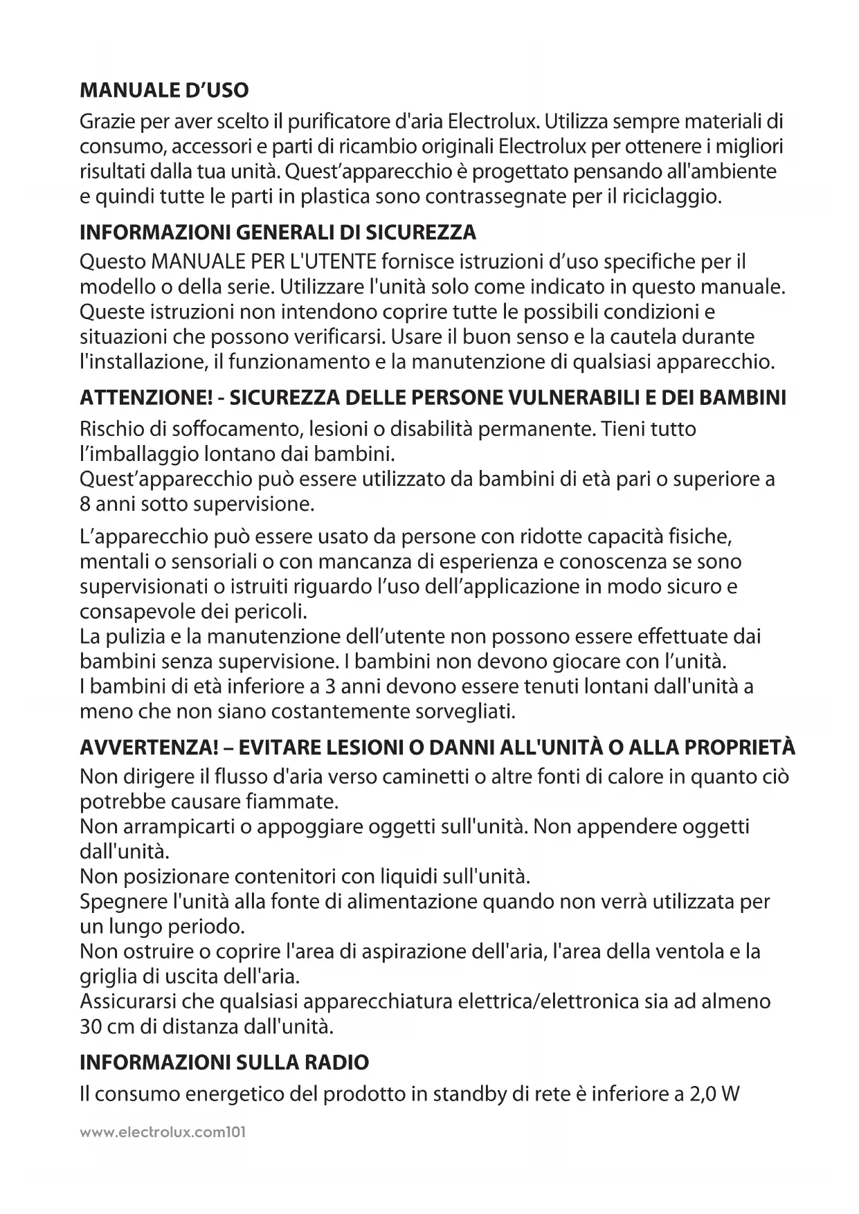 NOTA: Il tuo modello specifico potrebbe non avere tutti i componenti e le caratteristiche elencate in questo MANUALE PER L'UTENTE. Controllare la confezione del prodotto OPPURE la pagina delle specifiche del prodotto sul nostro sito web per i dettagli esatti del modello. Electrolux si riserva il diritto di modificare le informazioni qui contenute senza preavviso.www.electrolux.com104