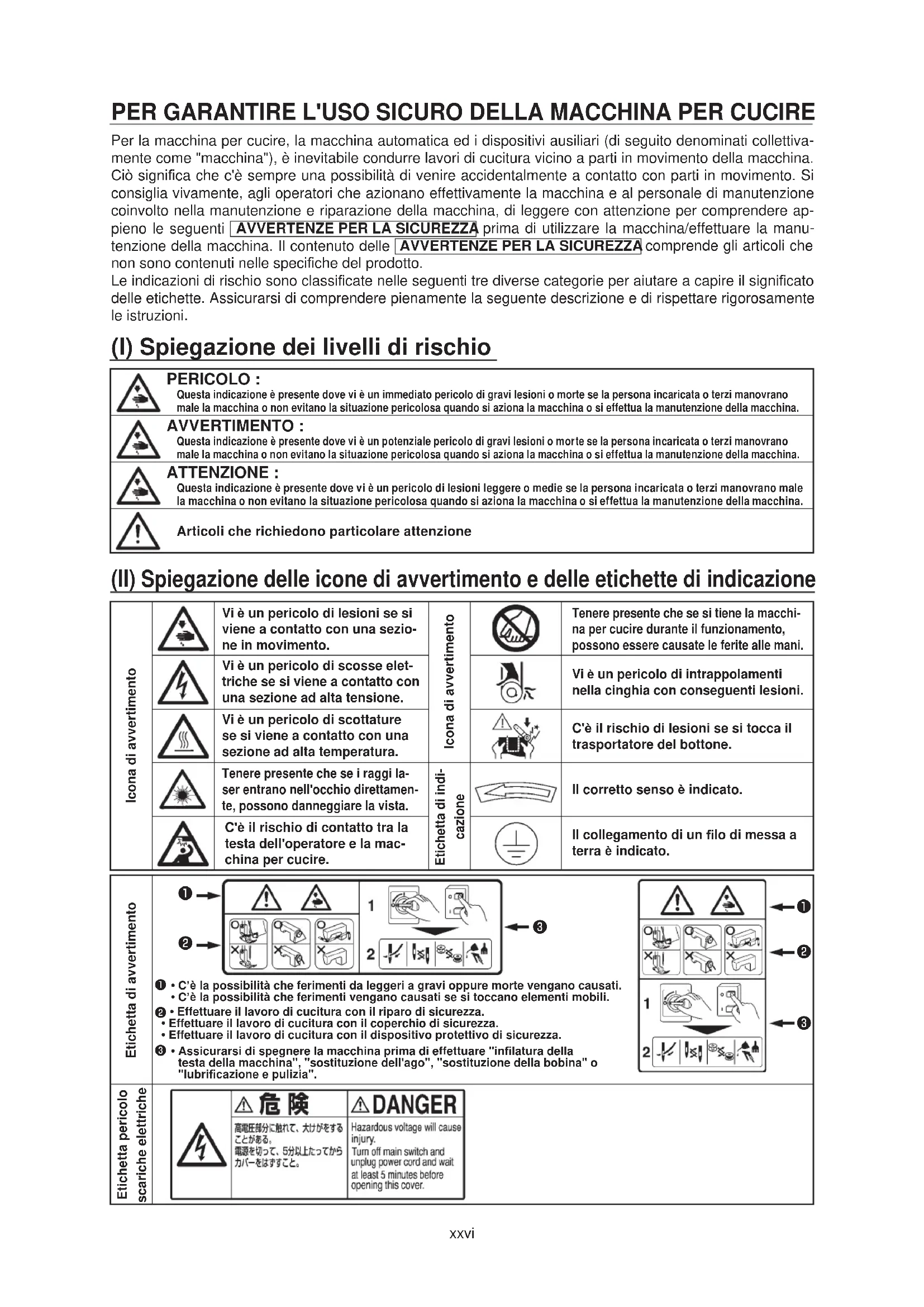 Icona di avvertimento Vi q un pericolo di lesioni se si viene a contatto con una sezio- ne in movimento. Icona di avvertimento Tenere presente che se si tiene la macchi- na per cucire durante il funzionamento, possono essere causate le ferite alle mani. Vi q un pericolo di scosse elet- triche se si viene a contatto con una sezione ad alta tensione. Vi q un pericolo di intrappolamenti nella cinghia con conseguenti lesioni. Vi q un pericolo di scottature se si viene a contatto con una sezione ad alta temperatura. Cq il rischio di lesioni se si tocca il trasportatore del bottone. Tenere presente che se i raggi la- ser entrano nellocchio direttamen- te, possono danneggiare la vista. Etichetta di indi- cazione Il corretto senso q indicato. Cq il rischio di contatto tra la testa delloperatore e la mac- china per cucire. Il collegamento di un ¿lo di messa a terra q indicato. PER GARANTIRE LUSO SICURO DELLA MACCHINA PER CUCIRE (I) Spiegazione dei livelli di rischio (II) Spiegazione delle icone di avvertimento e delle etichette di indicazione PERICOLO : Questa indicazione q presente dove vi q un immediato pericolo di gravi lesioni o morte se la persona incaricata o terzi manovrano male la macchina o non evitano la situazione pericolosa quando si aziona la macchina o si effettua la manutenzione della macchina. AVVERTIMENTO : Questa indicazione q presente dove vi q un potenziale pericolo di gravi lesioni o morte se la persona incaricata o terzi manovrano male la macchina o non evitano la situazione pericolosa quando si aziona la macchina o si effettua la manutenzione della macchina. ATTENZIONE : Questa indicazione q presente dove vi q un pericolo di lesioni leggere o medie se la persona incaricata o terzi manovrano male la macchina o non evitano la situazione pericolosa quando si aziona la macchina o si effettua la manutenzione della macchina. Articoli che richiedono particolare attenzionexxvii