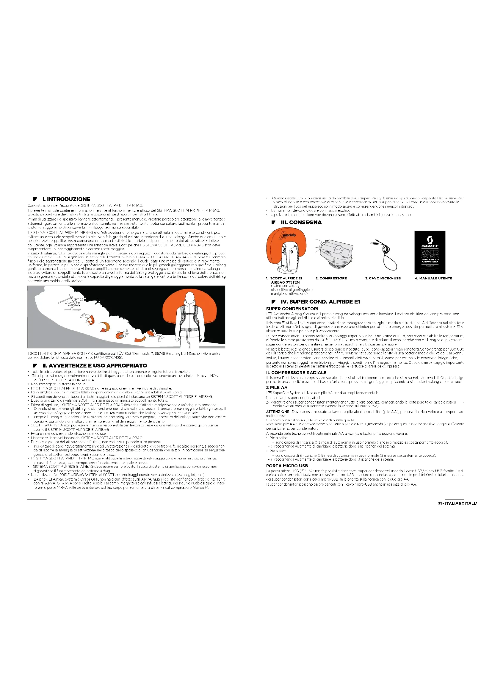 - I. INTRODUZIONE Congratulazioni per l’acquisto del SISTEMA SCOTT ALPRIDE E1 AIRBAG. Il presente manuale contiene informazioni relative al funzionamento e all’uso del SISTEMA SCOTT ALPRIDE E1 AIRBAG. Questo dispositivo è destinato a tutti gli appassionati degli sport invernali off limits. Prima di utilizzare il dispositivo, leggere attentamente il presente manuale. Prestare particolare attenzione alle avvertenze e attenersi rigorosamente alle informazioni contenute nel manuale utente. Per poter consultare facilmente il presente manua