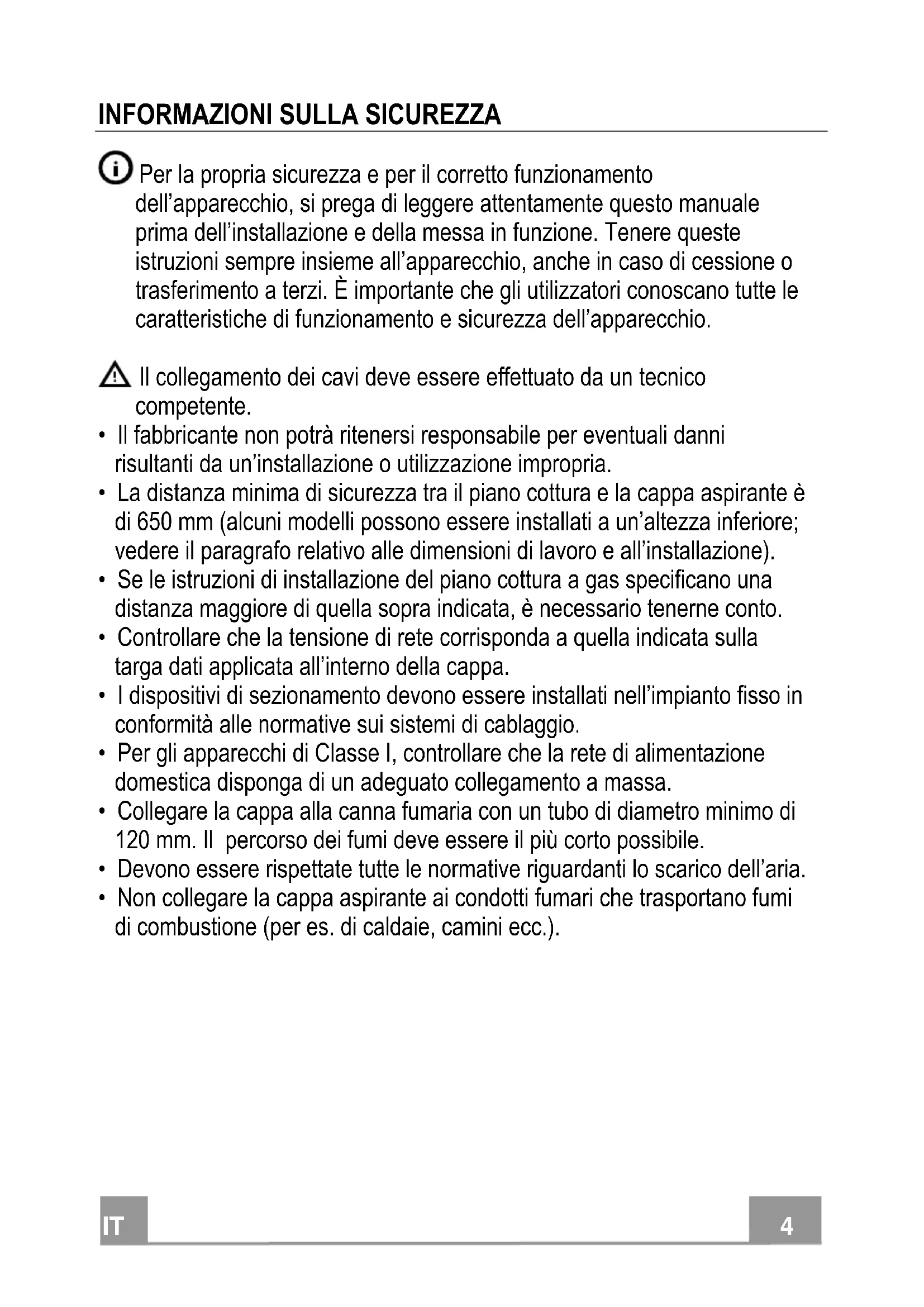- Non collegare la cappa aspirante ai condotti fumari che trasportano fumi di combustione (per es. di caldaie, camini ecc.).IT