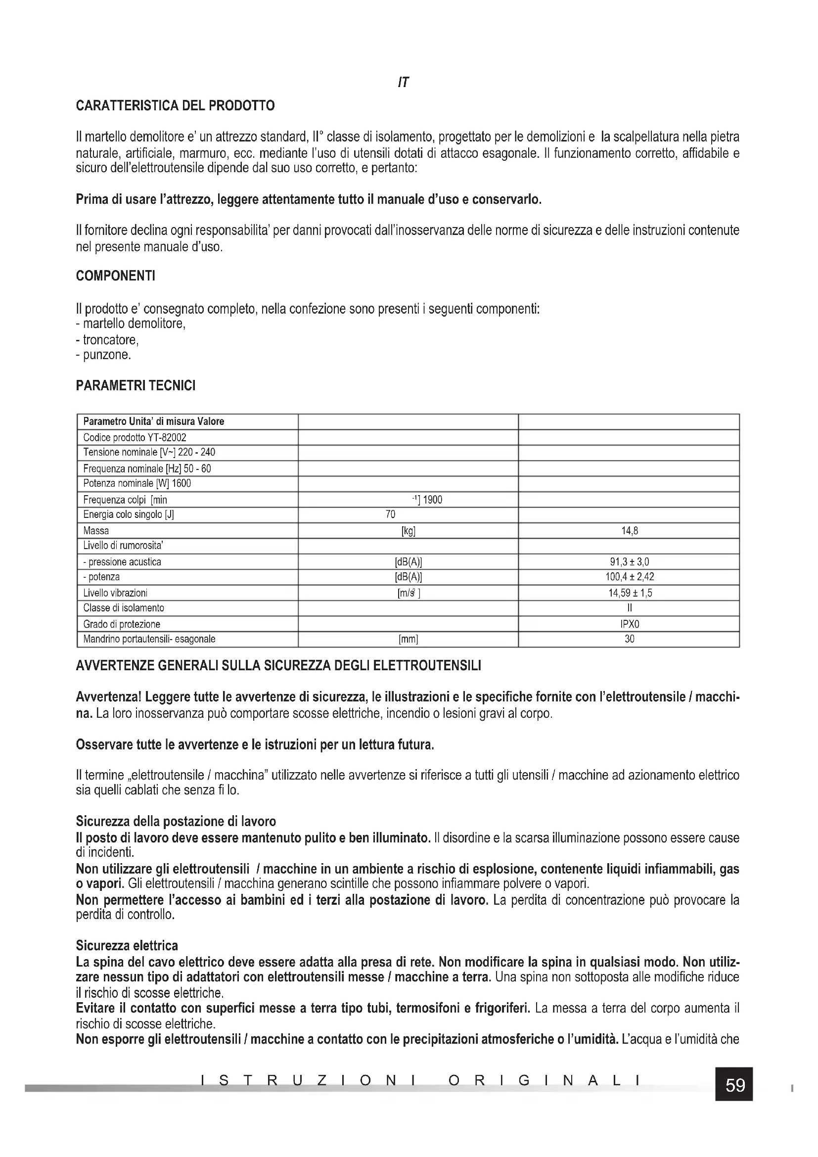 Il martello demolitore e’ un attrezzo standard, II° classe di isolamento, progettato per le demolizioni e la scalpellatura nella pietra naturale, artifi ciale, marmuro, ecc. mediante l’uso di utensili dotati di attacco esagonale. Il funzionamento corretto, affi dabile e sicuro dell’elettroutensile dipende dal suo uso corretto, e pertanto: Prima di usare l’attrezzo, leggere attentamente tutto il manuale d’uso e conservarlo. Il fornitore declina ogni responsabilita’ per danni provocati dall’inosservanza delle norme di sicurezza e delle instruzioni contenute nel presente manuale d’uso. COMPONENTI Il prodotto e’ consegnato completo, nella confezione sono presenti i seguenti componenti: - martello demolitore, - troncatore, - punzone. PARAMETRI TECNICI Parametro Unita’ di misura Valore Codice prodotto YT-82002 Tensione nominale [V~] 220 - 240 Frequenza nominale [Hz] 50 - 60 Potenza nominale [W] 1600 Frequenza colpi [min