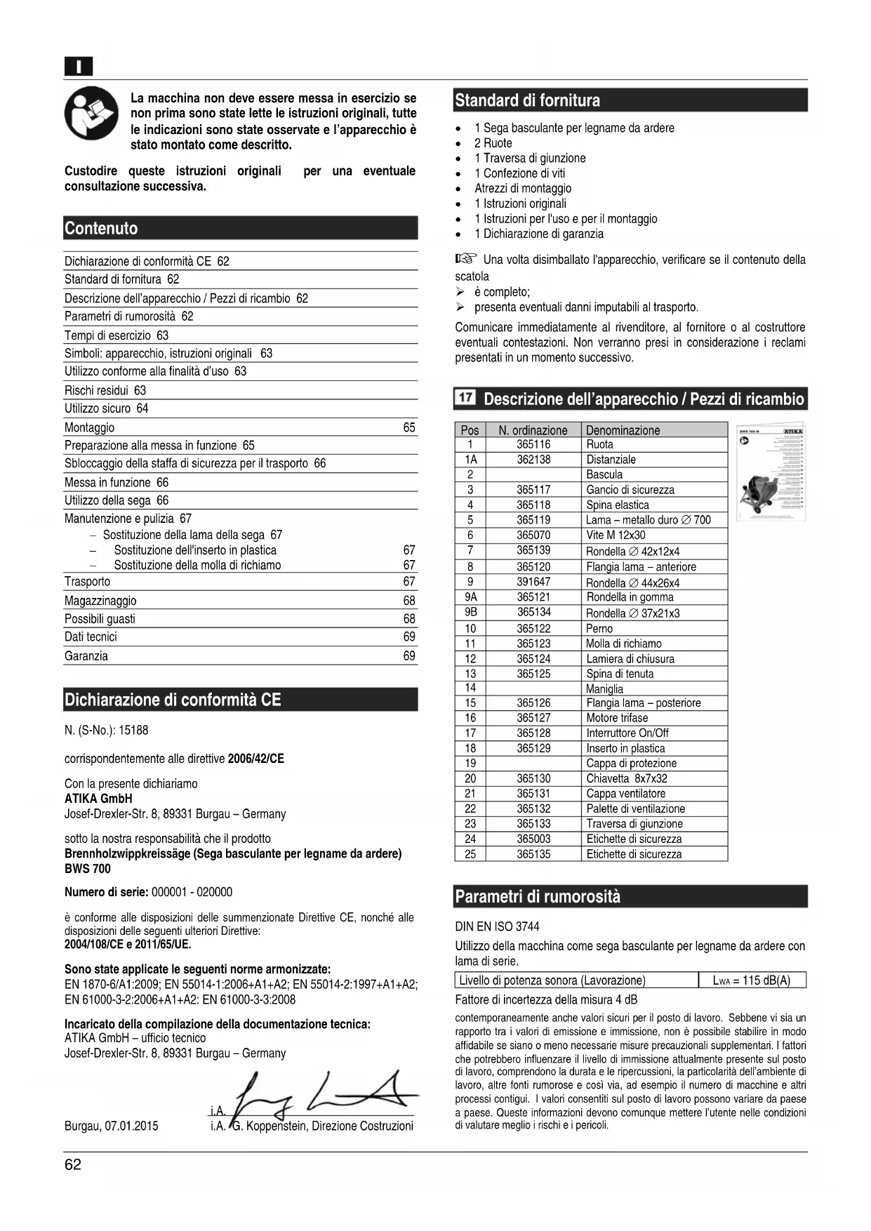 Dichiarazione di conformità CE N. (S-No.): 15188 corrispondentemente alle direttive 2006/42/CE Con la presente dichiariamo ATIKA GmbH Josef-Drexler-Str. 8, 89331 Burgau – Germany sotto la nostra responsabilità che il prodotto Brennholzwippkreissäge (Sega basculante per legname da ardere) BWS 700 Numero di serie: 000001 - 020000 è conforme alle disposizioni delle summenzionate Direttive CE, nonché alle disposizioni delle seguenti ulteriori Direttive: 2004/108/CE e 2011/65/UE. Sono state applicate le seguenti norme armonizzate: EN 1870-6/A1:2009; EN 55014-1:2006+A1+A2; EN 55014-2:1997+A1+A2; EN 61000-3-2:2006+A1+A2: EN 61000-3-3:2008 Incaricato della compilazione della documentazione tecnica: ATIKA GmbH – ufficio tecnico Josef-Drexler-Str. 8, 89331 Burgau – Germany
