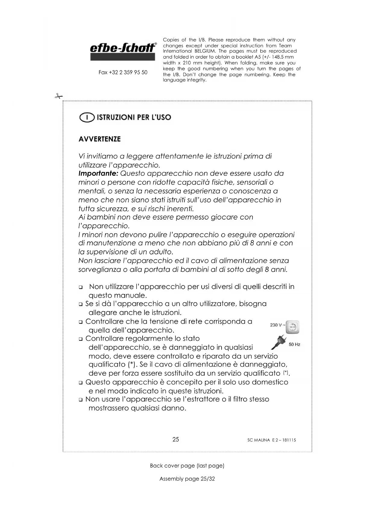 DIRETTIVA 2012/19/CE PER LO SMALTIMENTO DELLE APPARECCHIATURE ELETTRICHE ED ELETTRONICHE Per preservare l'ambiente e la nostra salute, l'eliminazione dei vecchi apparecchi elettrici e elettronici non più utilizzati, va fatta secondo la direttiva sopra citata che impone l'obbligo al costruttore, al commerciante e a l'utilizzatore di consegnare gli apparecchi ai centri di raccolta specializzati, i quali saranno in grado di smaltire e riciclare i vecchi prodotti come la legge prescrive. Per questa ragione troverete apposto sulla etichetta segnaletica il simbolo che indica di non gettare il vecchio apparecchio non più utilizzato, in pattumiera o nel cassonetto delle immondizie. Per eliminare il vecchio apparecchio non più utilizzato, potete consegnarlo al rivenditore il cambio di quello nuovo acquistato, o direttamente nei centri di raccolta specializzati messi a disposizione dal vostro comune di residenza. Copies of the I/B. Please reproduce them without any changes except under special instruction from Team International BELGIUM. The pages must be reproduced and folded in order to obtain a booklet A5 (+/- 148.5 mm width x 210 mm height). When folding, make sure you keep the good numbering when you turn the pages of the I/B. Don’t change the page numbering. Keep the language integrity.