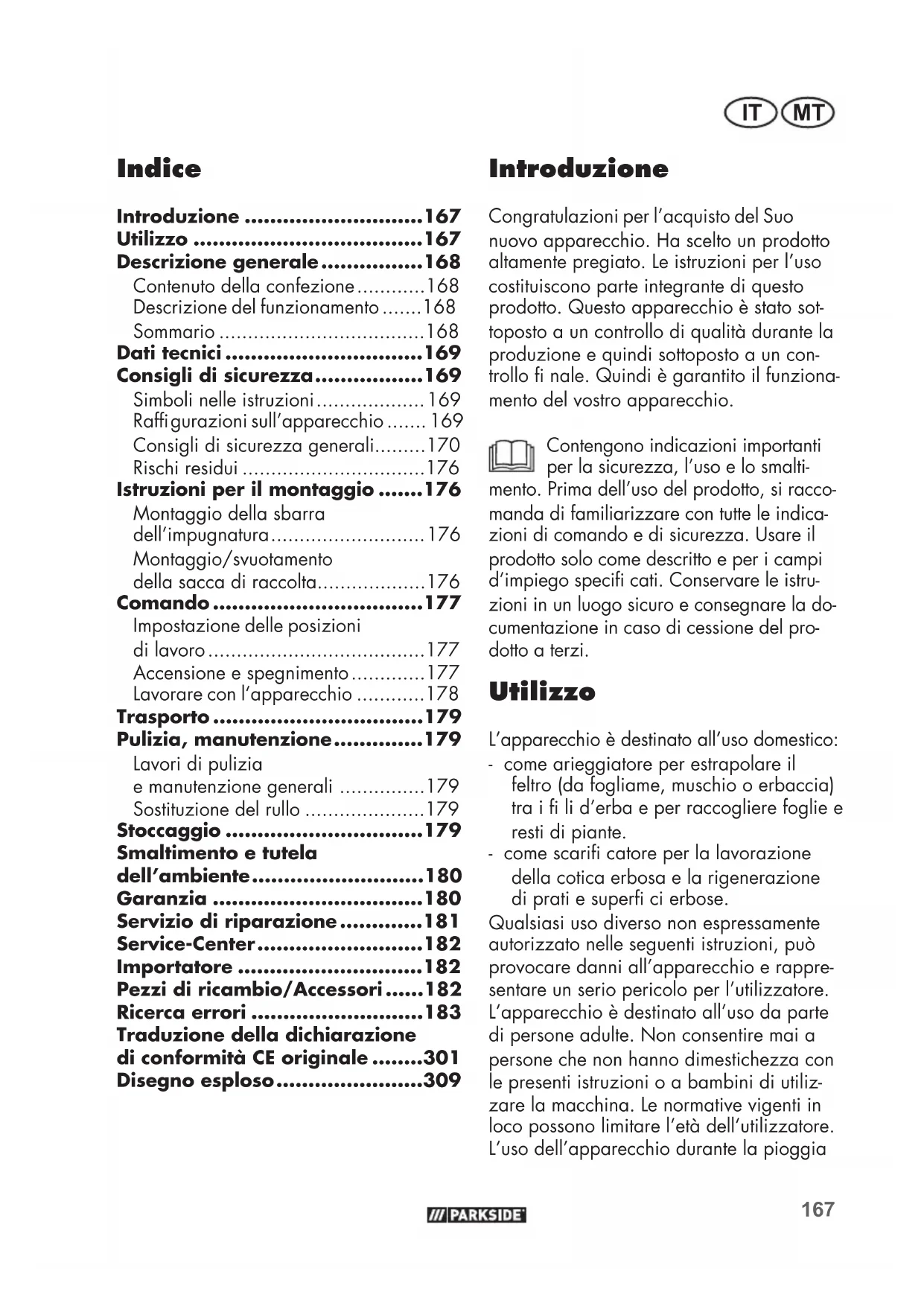 - Tras consultar con nuestro servicio de postventa, un aparato identi cado como defectuoso puede ser enviado li- bre de franqueo a la dirección de servi- cio ya conocida por usted, adjuntando el comprobante de compra (resguardo de caja) e indicando en qué consiste el defecto y cuándo surgió. Para evitar problemas de recepción y costes adicio- nales, utilice de todas maneras sólo la dirección que se le comunicará. Asegú- rese de que el envío no se efectúe sin franqueo, como mercancía voluminosa, expréss u otro tipo de transporte espe- cial. Envíe por favor el aparato inclu- yendo todos los accesorios entregados con la compra y garantice un embalaje de transporte lo su cientemente seguro. Servicio de reparación Reparaciones que no están cubiertas por la garantía, las puede dejar efectuar por nuestra lial de servicio por cuenta suya. Ésta le elaborará gustosamente un presu- puesto. Sólo atenderemos aparatos que hayan sido enviados en un embalaje su - ciente y franqueados. Atención: Por favor, envíe el aparato lim- pio, señalando el defecto a nuestra lial de servicio. No aceptaremos aparatos que hayan sido enviados sin franqueo, como mercancía voluminosa, expréss o cualquier tipo de transporte especial. Nos encargamos gratuitamente de la eliminación de sus aparatos defectuosos enviados. Service-Center Servicio España Tel.: 900 984 989 E-Mail: grizzly@lidl.es IAN 373769_2204 Importador Por favor, observe que la siguiente direc- ción no es una dirección de servicio. Con- tacte primeramente al centro de servicio mencionado arriba. Grizzly Tools GmbH & Co. KG Stockstädter Straße 20 63762 Großostheim Alemania www.grizzlytools.de ES167 MTIT Indice Introduzione ............................167 Utilizzo ....................................167 Descrizione generale ................168 Contenuto della confezione ............168 Descrizione del funzionamento .......168 Sommario ....................................168 Dati tecnici ...............................169 Consigli di sicurezza .................169 Simboli nelle istruzioni ................... 169 Raf gurazioni sull’apparecchio ....... 169 Consigli di sicurezza generali.........170 Rischi residui ................................176 Istruzioni per il montaggio .......176 Montaggio della sbarra dell’impugnatura ........................... 176 Montaggio/svuotamento della sacca di raccolta ...................176 Comando .................................177 Impostazione delle posizioni di lavoro ......................................177 Accensione e spegnimento .............177 Lavorare con l’apparecchio ............178 Trasporto .................................179 Pulizia, manutenzione ..............179 Lavori di pulizia e manutenzione generali ...............179 Sostituzione del rullo .....................179 Stoccaggio ...............................179 Smaltimento e tutela dell’ambiente ...........................180 Garanzia .................................180 Servizio di riparazione .............181 Service-Center ..........................182 Importatore .............................182 Pezzi di ricambio/Accessori ......182 Ricerca errori ...........................183 Introduzione Congratulazioni per l’acquisto del Suo nuovo apparecchio. Ha scelto un prodotto altamente pregiato. Le istruzioni per l’uso costituiscono parte integrante di questo prodotto. Questo apparecchio è stato sot- toposto a un controllo di qualità durante la produzione e quindi sottoposto a un con- trollo nale. Quindi è garantito il funziona- mento del vostro apparecchio. Contengono indicazioni importanti per la sicurezza, l’uso e lo smalti- mento. Prima dell’uso del prodotto, si racco- manda di familiarizzare con tutte le indica- zioni di comando e di sicurezza. Usare il prodotto solo come descritto e per i campi d’impiego speci cati. Conservare le istru- zioni in un luogo sicuro e consegnare la do- cumentazione in caso di cessione del pro- dotto a terzi. Utilizzo L’apparecchio è destinato all’uso domestico: - come arieggiatore per estrapolare il feltro (da fogliame, muschio o erbaccia) tra i li d’erba e per raccogliere foglie e resti di piante. - come scari catore per la lavorazione della cotica erbosa e la rigenerazione di prati e super ci erbose. Qualsiasi uso diverso non espressamente autorizzato nelle seguenti istruzioni, può provocare danni all’apparecchio e rappre- sentare un serio pericolo per l’utilizzatore. L’apparecchio è destinato all’uso da parte di persone adulte. Non consentire mai a persone che non hanno dimestichezza con le presenti istruzioni o a bambini di utiliz- zare la macchina. Le normative vigenti in loco possono limitare l’età dell’utilizzatore. L’uso dell’apparecchio durante la pioggia Traduzione della dichiarazione di conformità CE originale ........301 Disegno esploso .......................309168 IT MT o in un ambiente umido è vietato.L’utilizzatore o utente è responsabile per infortuni o danni ad altre persone o alla proprietà delle medesime.Il fabbricante declina ogni responsabilità per danni causati da un uso improprio o un comando errato dell’apparecchio. Descrizione generale Contenuto della confezione Rimuovere delicatamente l’apparecchio dalla confezione e controllare se le seguen-ti parti sono complete:• Alloggiamento apparecchio con rullo scari catore e protezione antiurto• Rullo arieggiatore• Sbarra superiore dell’impugnatura• Sbarra inferiore• 2 Sbarre centrali • Sacco di raccolta con asta• Scarico trazione cavo di alimentazione• 2 fermacavi• 6 Dadi a galletto4 Viti6 Rondelle2 Tappi terminali piatti• Supporto a parete• Istruzioni per l’uso Descrizione del funzionamento Lo scari catore e arieggiatore elettrico è dotato di due cilindri di lavoro facilmente sostituibili: un cilindro aeratore di plastica dura con rebbi rotanti verticalmente e un cilindro scari catore con lame di acciaio inox ssa-te orizzontalmente. L’app
