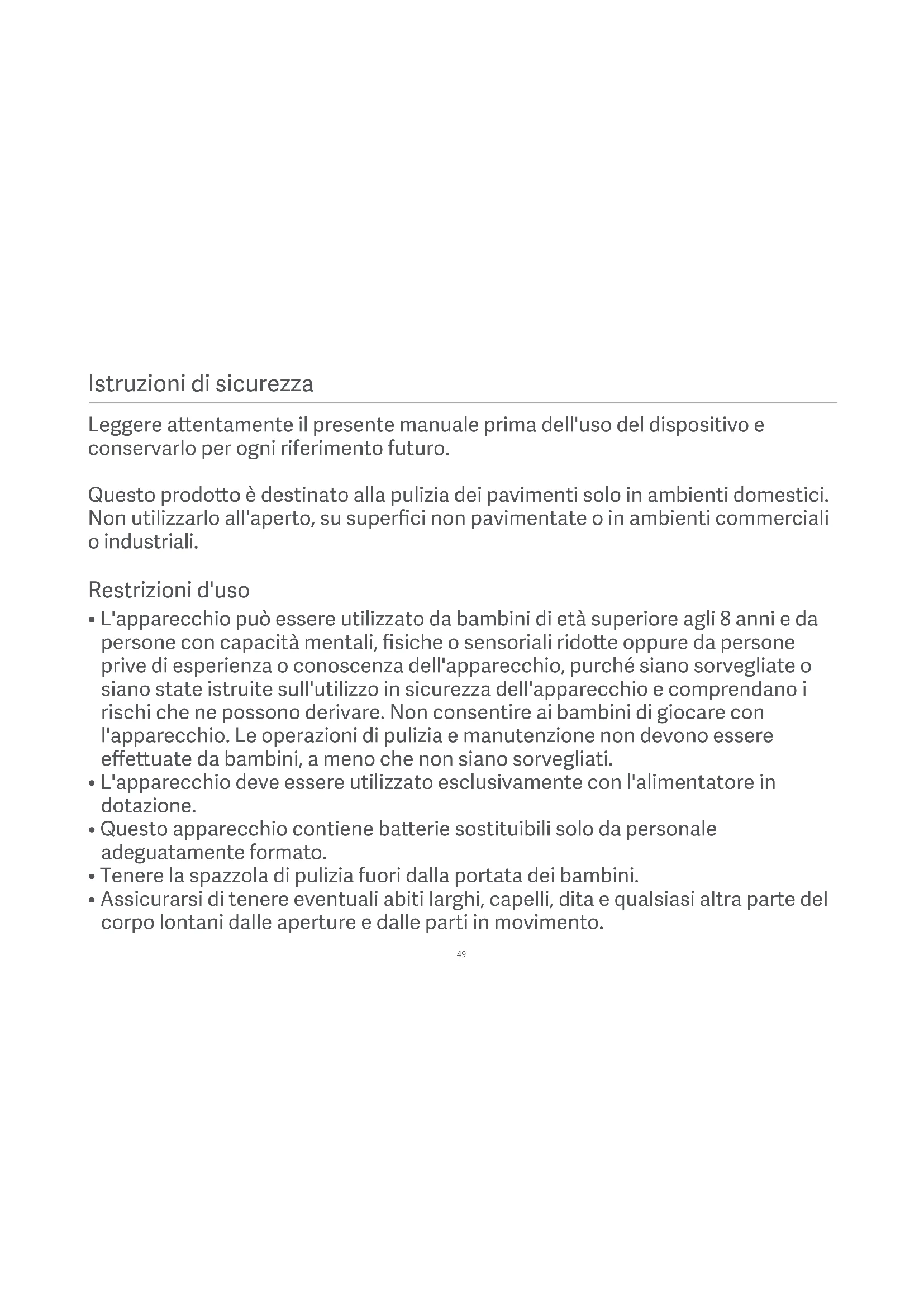 - Assicurarsi di tenere eventuali abiti larghi, capelli, dita e qualsiasi altra parte del corpo lontani dalle aperture e dalle parti in movimento. Leggere aentamente il presente manuale prima dell'uso del dispositivo e conservarlo per ogni riferimento futuro. Questo prodoo è destinato alla pulizia dei pavimenti solo in ambienti domestici. Non utilizzarlo all'aperto, su superfici non pavimentate o in ambienti commerciali o industriali.50