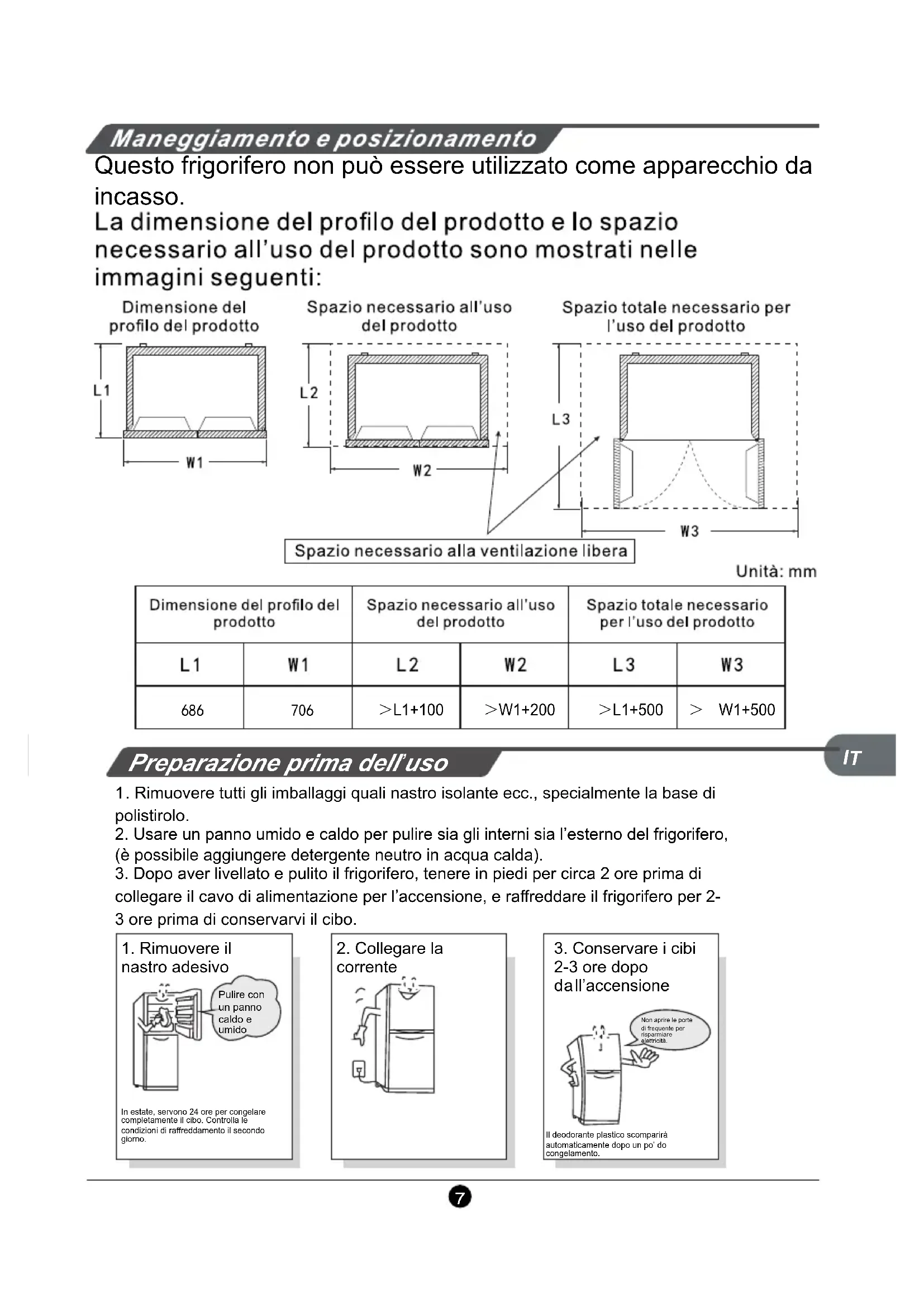 . Rimuovere tutti gli imballaggi quali nastro isolante ecc., specialmente la base di polistirolo. 2. Usare un panno umido e caldo per pulire sia gli interni sia l’esterno del frigorifero,(è possibile aggiungere detergente neutro in acqua calda). 3. Dopo aver livellato e pulito il frigorifero, tenere in piedi per circa 2 ore prima dicollegare il cavo di alimentazione per l’accensione, e raffreddare il frigorifero per 2-3 ore prima di conservarvi il cibo.