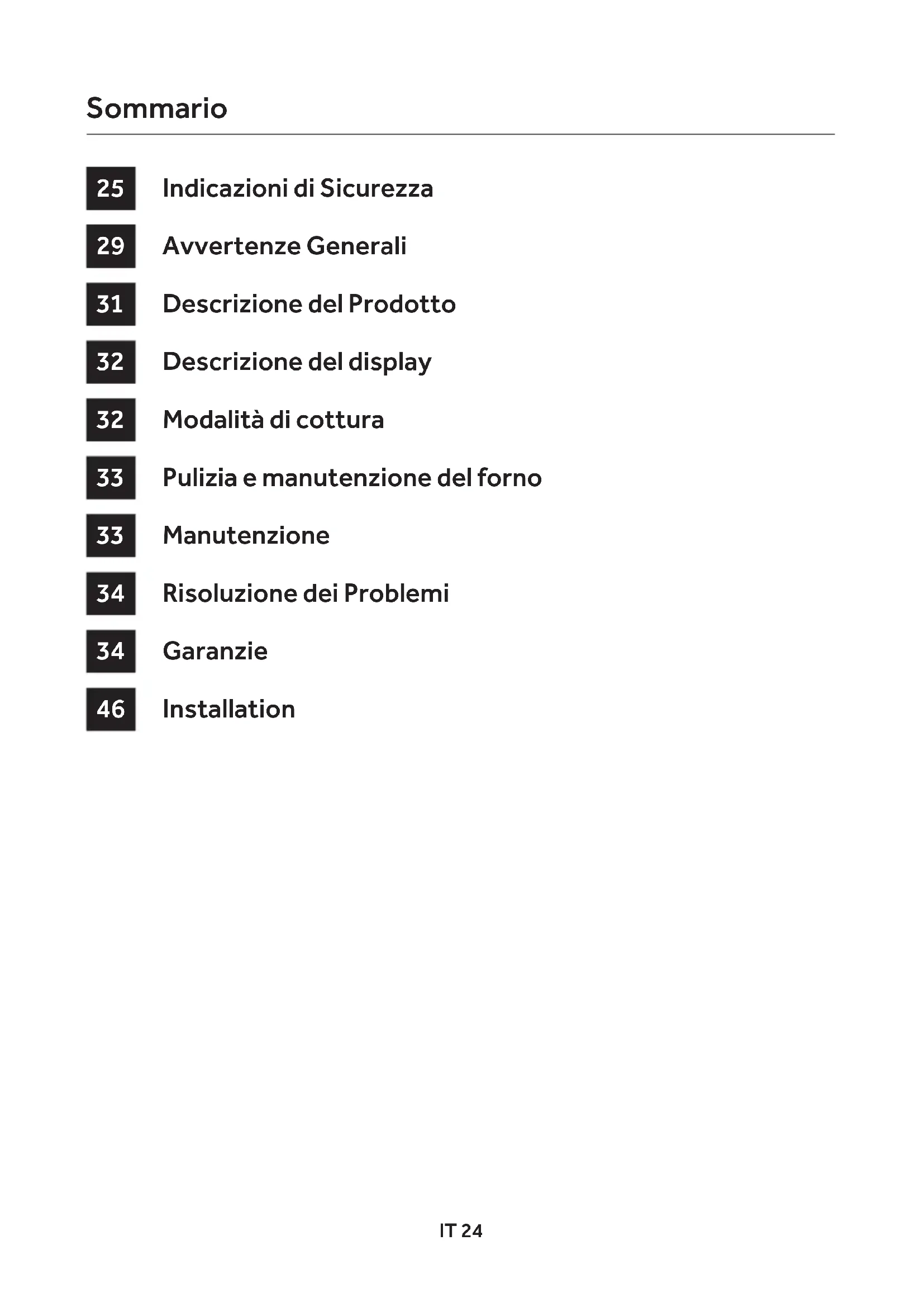 Ove possibile, evitare di pre-riscaldare il forno e cercare sempre di riempirlo. Aprire la porta del forno quanto necessario, perché vi sono disper- sioni di calore ogni volta che viene aperta. Per ris- parmiare molta energia sarà suciente spegnere il forno dai 5 ai 10 minuti prima della fine del tem- po di cottura pianificato, e servirsi del calore che il forno continua a generare. Tenere le guarnizioni pulite e in ordine, per evitare eventuali dispersioni di energia. Se si dispone di un contratto di ener- gia elettrica a taria oraria, il programma “cottura ritardata” renderà più semplice il risparmio spo- stando l’avvio del programma negli orari a taria ridotta.ES 35 Indicaciones de seguridad Advertencias Generales Descripción del producto Descripción general Modalidades de cocción Limpieza y mantenimiento del horno Mantenimiento Solución de problemas Installation Índice