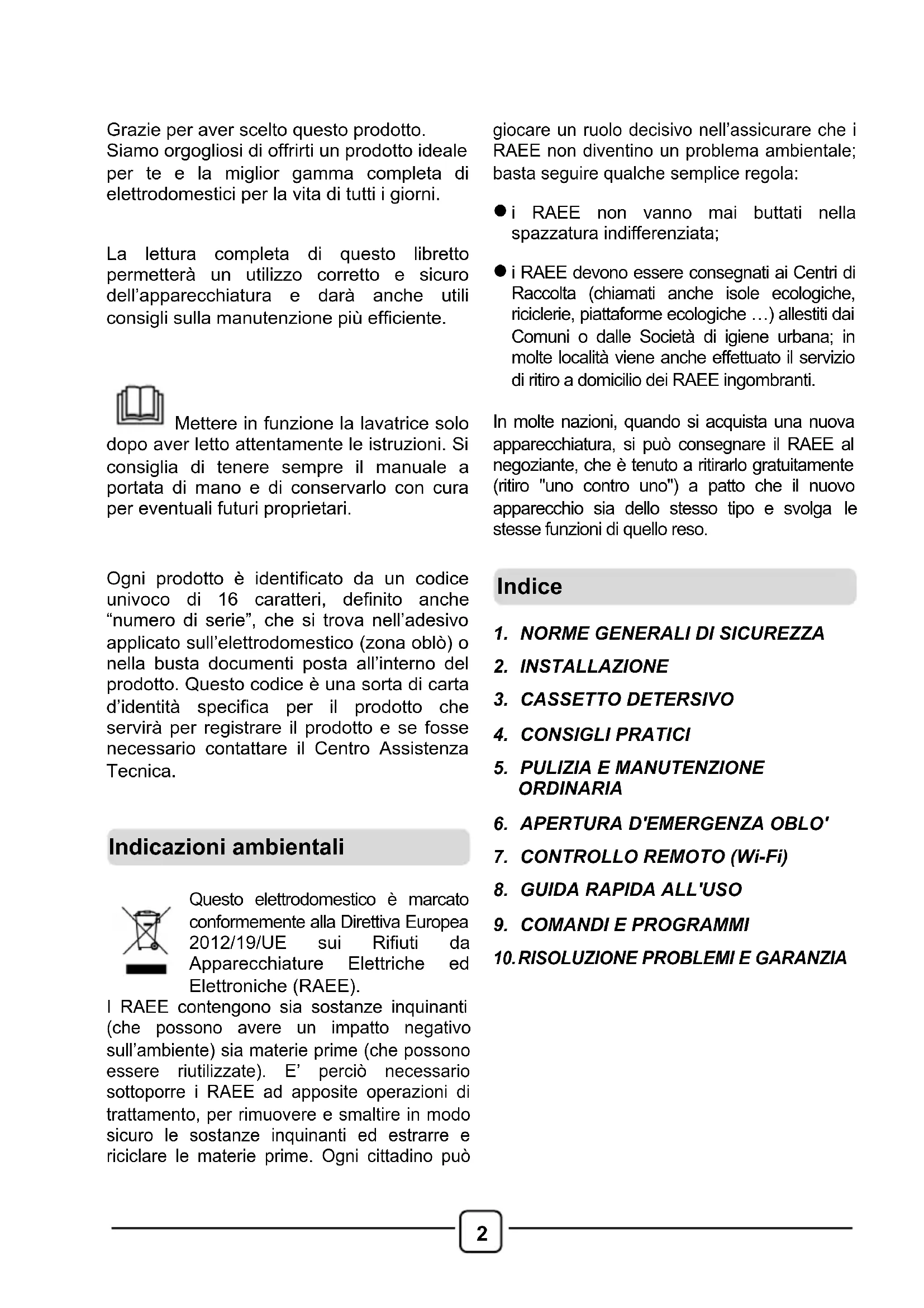Mettere in funzione la lavatrice solo dopo aver letto attentamente le istruzioni. Si consiglia di tenere sempre il manuale a portata di mano e di conservarlo con cura per eventuali futuri proprietari.