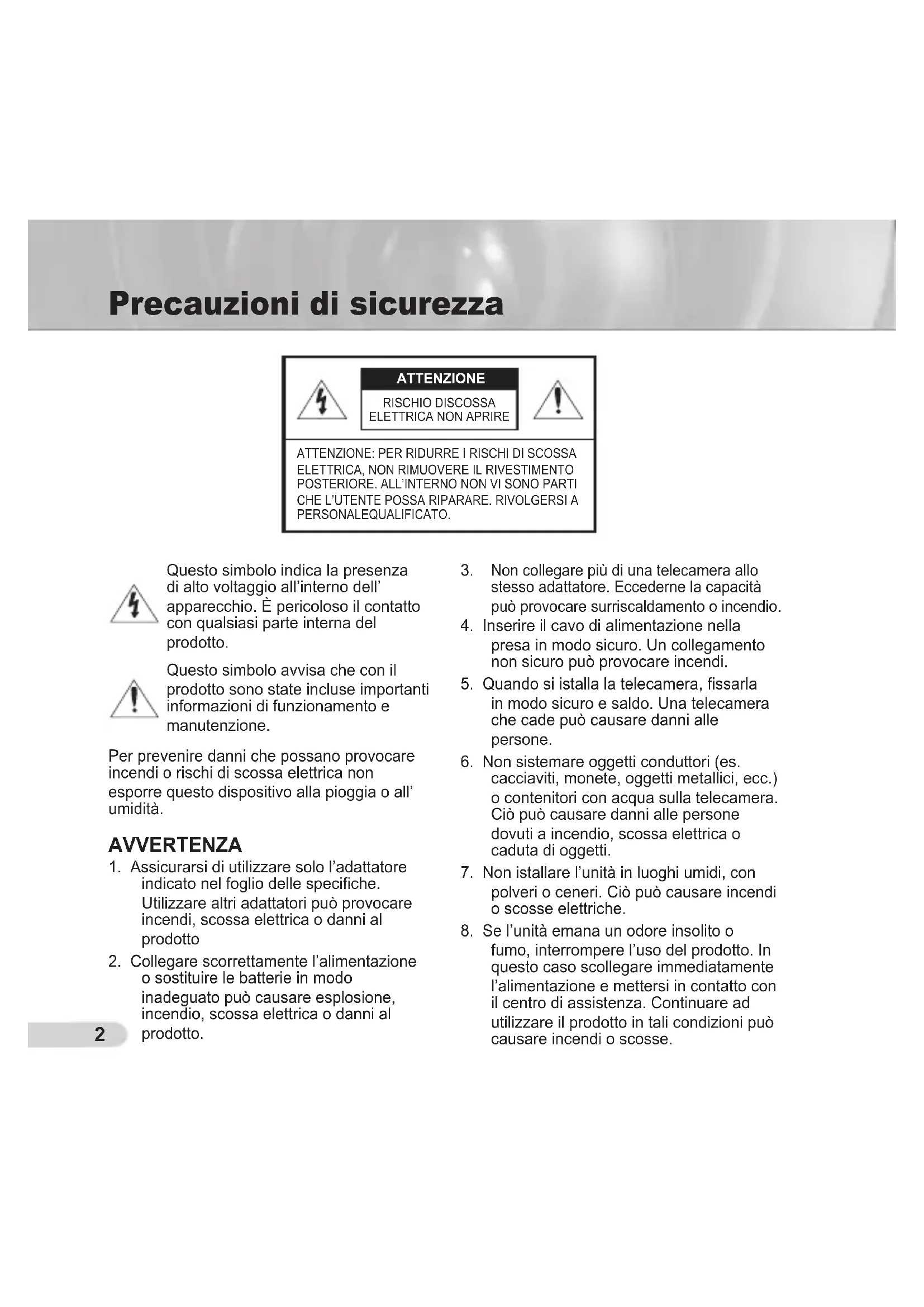 fumo, interrompere l’uso del prodotto. In questo caso scollegare immediatamente l’alimentazione e mettersi in contatto con il centro di assistenza. Continuare ad utilizzare il prodotto in tali condizioni può causare incendi o scosse. Precauzioni di sicurezza ATTENZIONE: PER RIDURRE I RISCHI DI SCOSSA ELETTRICA, NON RIMUOVERE IL RIVESTIMENTO POSTERIORE. ALL’INTERNO NON VI SONO PARTI CHE L’UTENTE POSSA RIPARARE. RIVOLGERSI A PERSONALEQUALIFICATO. ATTENZIONE