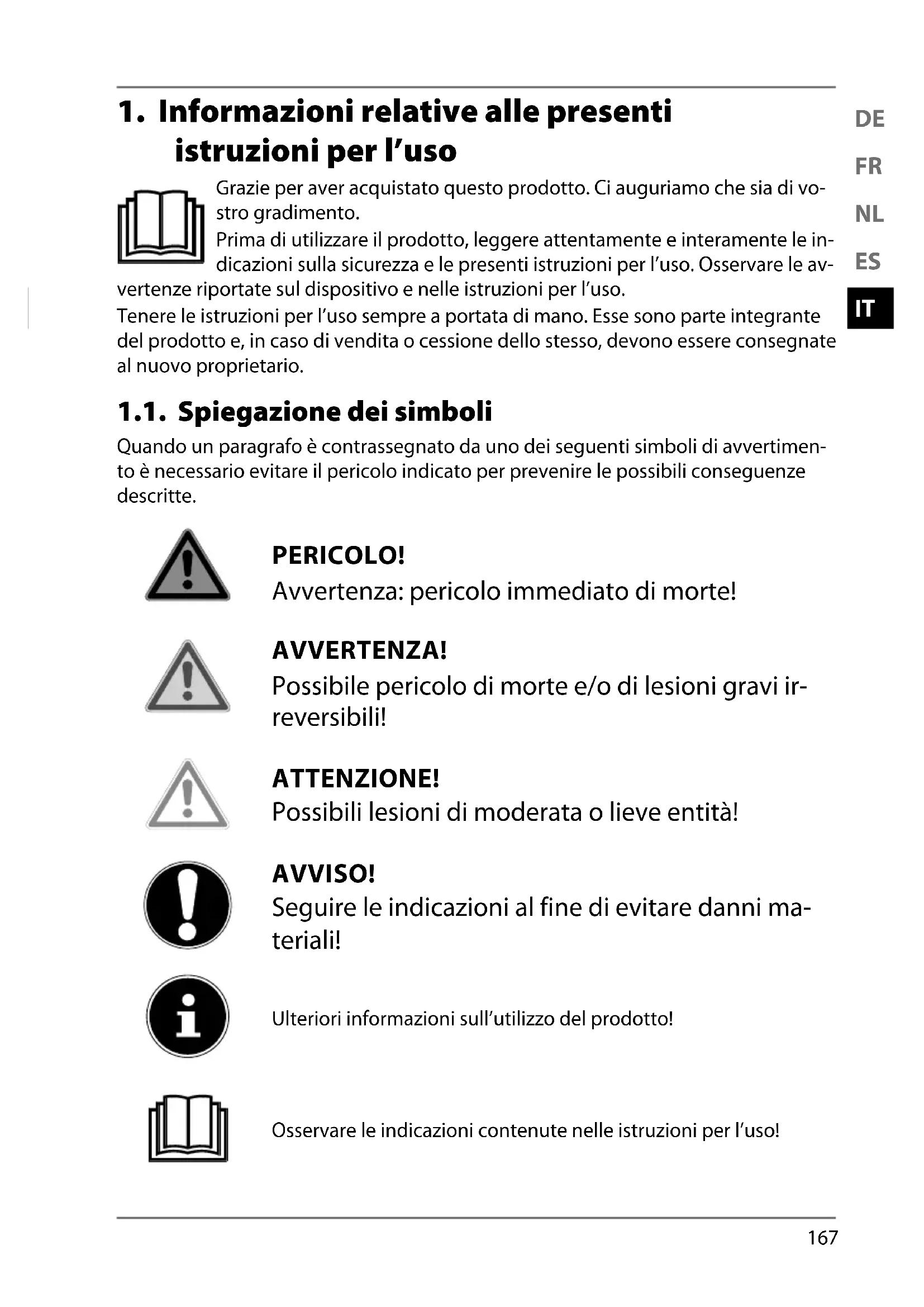 istruzioni per l’uso Grazie per aver acquistato questo prodotto. Ci auguriamo che sia di vo- stro gradimento. Prima di utilizzare il prodotto, leggere attentamente e interamente le in- dicazioni sulla sicurezza e le presenti istruzioni per l’uso. Osservare le av- vertenze riportate sul dispositivo e nelle istruzioni per l’uso. Tenere le istruzioni per l’uso sempre a portata di mano. Esse sono parte integrante del prodotto e, in caso di vendita o cessione dello stesso, devono essere consegnate al nuovo proprietario. 1.1. Spiegazione dei simboli Quando un paragrafo è contrassegnato da uno dei seguenti simboli di avvertimen- to è necessario evitare il pericolo indicato per prevenire le possibili conseguenze descritte. PERICOLO! Avvertenza: pericolo immediato di morte! AVVERTENZA! Possibile pericolo di morte e/o di lesioni gravi ir- reversibili! ATTENZIONE! Possibili lesioni di moderata o lieve entità! AVVISO! Seguire le indicazioni al fine di evitare danni ma- teriali! Ulteriori informazioni sull’utilizzo del prodotto! Osservare le indicazioni contenute nelle istruzioni per l’uso!168 AVVERTENZA! Avvertenza: pericolo di scosse elettriche! AVVERTENZA! Pericolo causato da materiali infiammabili e/o fa- cilmente infiammabili! AVVERTENZA! Pericolo causato da materiali a rischio di esplosio- ne!