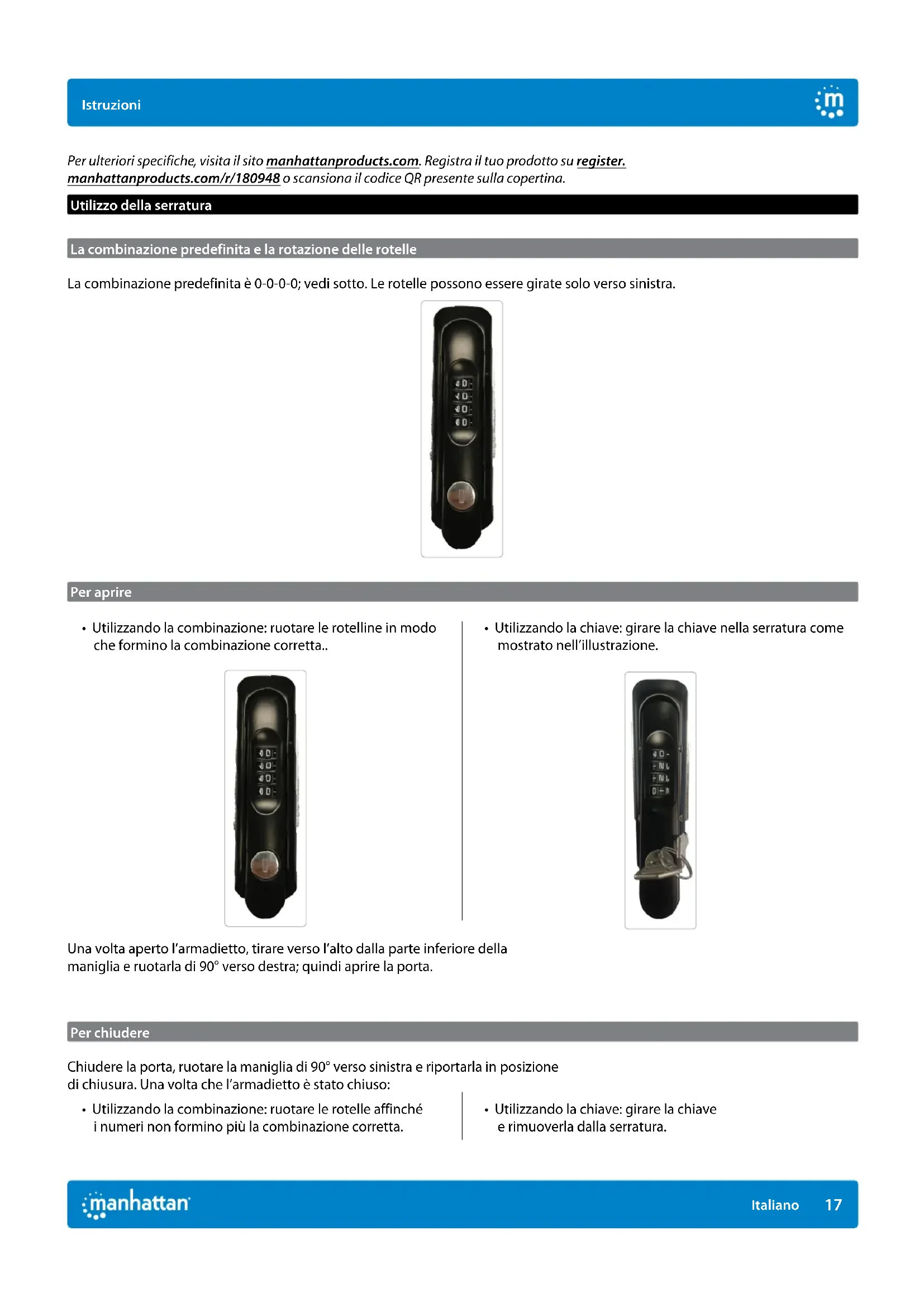 Istruzioni Italiano Per ulteriori specifiche, visita il sito manhattanproducts.com. Registra il tuo prodotto su register. manhattanproducts.com/r/180948 o scansiona il codice QR presente sulla copertina. Utilizzo della serratura La combinazione predefinita e la rotazione delle rotelle La combinazione predefinita è 0-0-0-0; vedi sotto. Le rotelle possono essere girate solo verso sinistra. Per aprire