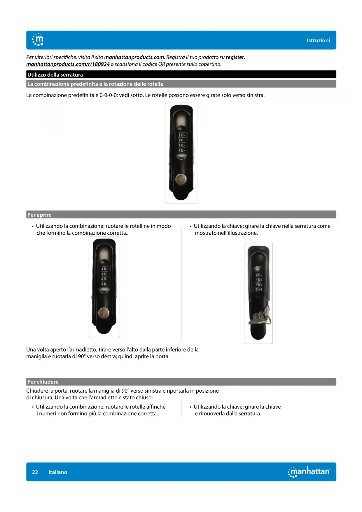 Instrukcje Polski22 Istruzioni Italiano Per ulteriori specifiche, visita il sito manhattanproducts.com. Registra il tuo prodotto su register. manhattanproducts.com/r/180924 o scansiona il codice QR presente sulla copertina. Utilizzo della serratura La combinazione predefinita e la rotazione delle rotelle La combinazione predefinita è 0-0-0-0; vedi sotto. Le rotelle possono essere girate solo verso sinistra. Per aprire