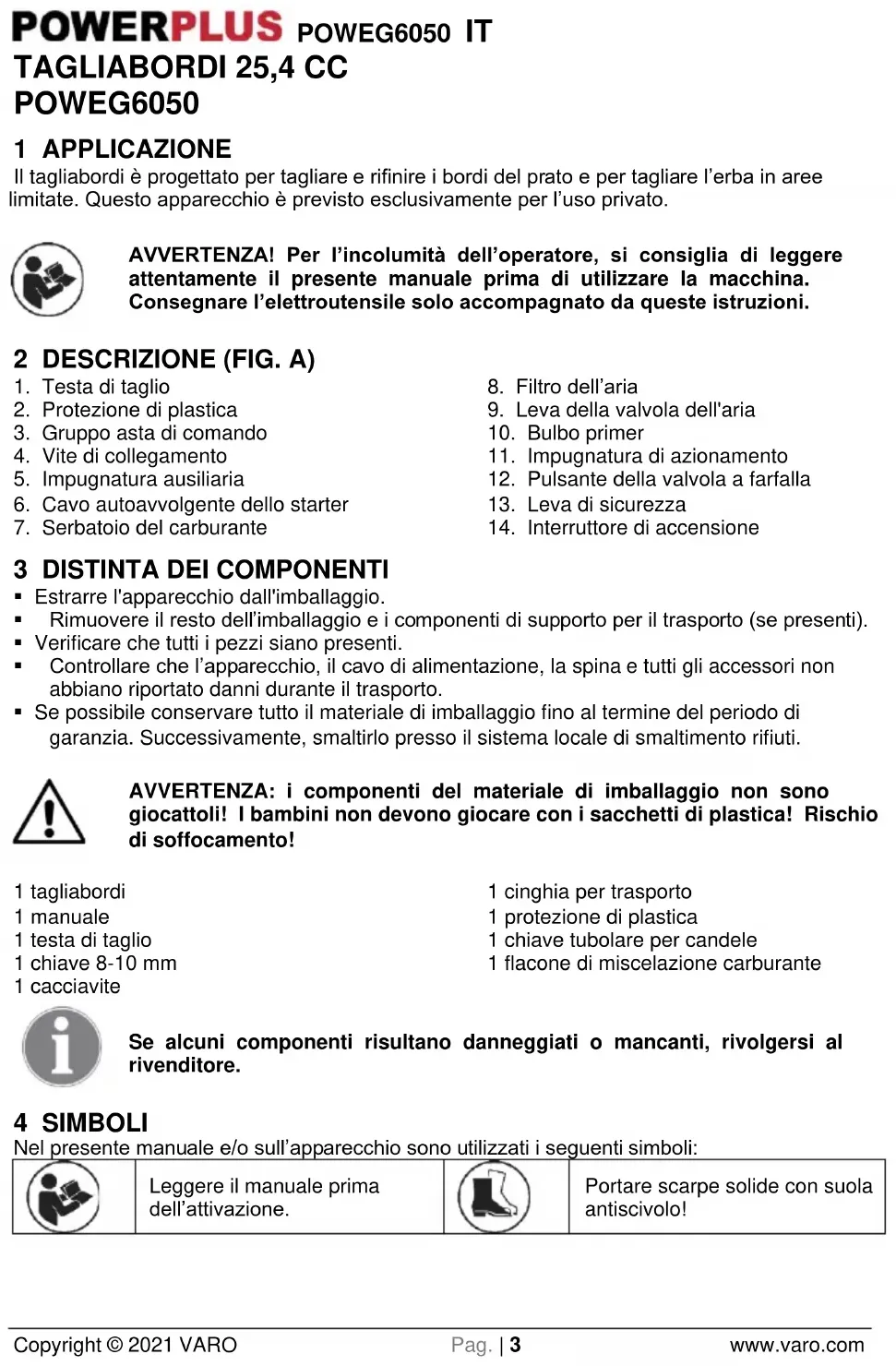 Copyright © 2021 VARO Pag. | 3 www.varo.com TAGLIABORDI 25,4 CC POWEG6050 1 APPLICAZIONE Il tagliabordi è progettato per tagliare e rifinire i bordi del prato e per tagliare l’erba in aree limitate. Questo apparecchio è previsto esclusivamente per l’uso privato. AVVERTENZA! Per l’incolumità dell’operatore, si consiglia di leggere attentamente il presente manuale prima di utilizzare la macchina. Consegnare l’elettroutensile solo accompagnato da queste istruzioni. 2 DESCRIZIONE (FIG. A)