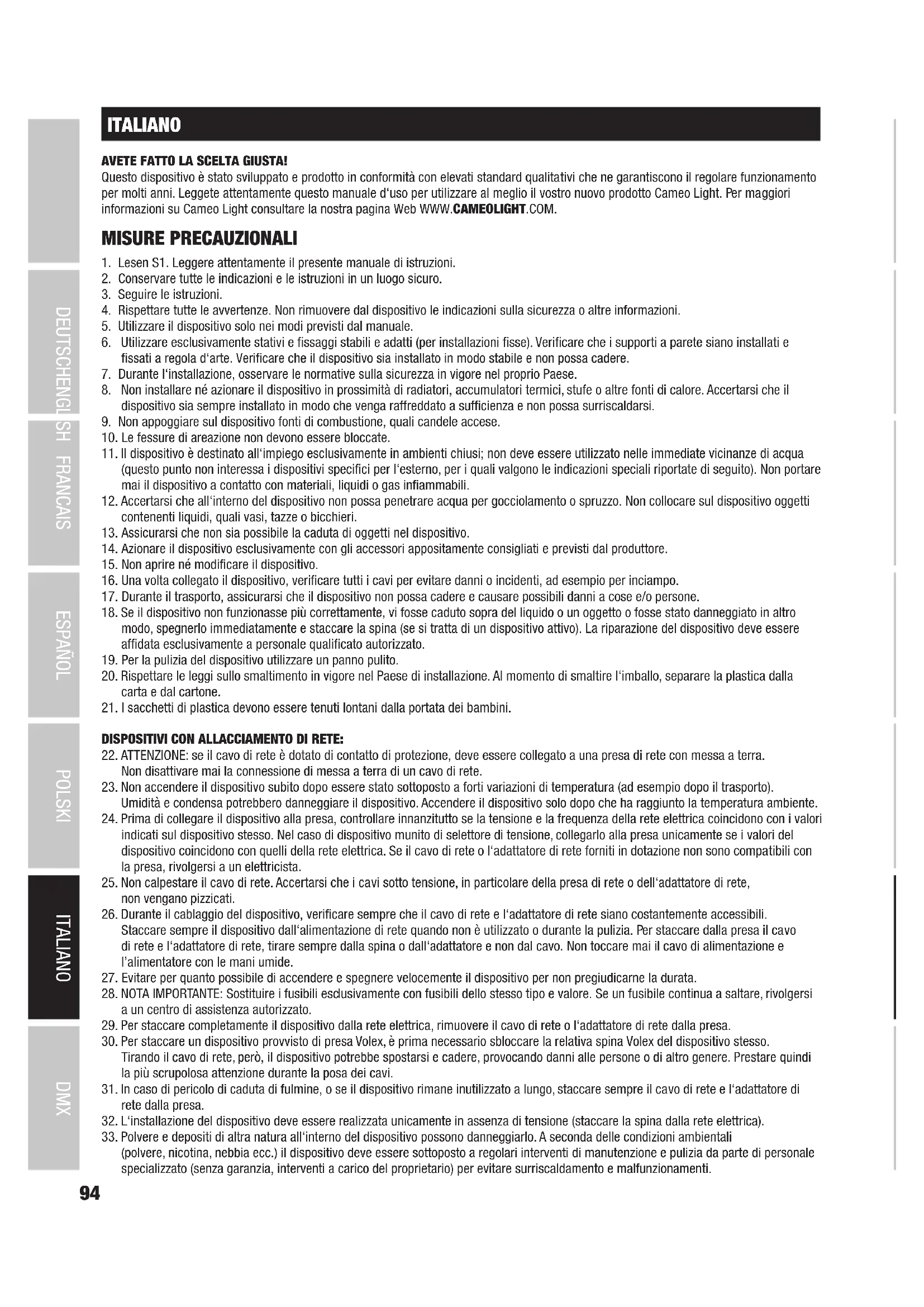 28. NOTA IMPORTANTE: Sostituire i fusibili esclusivamente con fusibili dello stesso tipo e valore. Se un fusibile continua a saltare, rivolgersi a un centro di assistenza autorizzato. 29. Per staccare completamente il dispositivo dalla rete elettrica, rimuovere il cavo di rete o l‘adattatore di rete dalla presa. 30. Per staccare un dispositivo provvisto di presa Volex, è prima necessario sbloccare la relativa spina Volex del dispositivo stesso. Tirando il cavo di rete, però, il dispositivo potrebbe spostarsi e cadere, provocando danni alle persone o di altro genere. Prestare quindi la più scrupolosa attenzione durante la posa dei cavi. 31. In caso di pericolo di caduta di fulmine, o se il dispositivo rimane inutilizzato a lungo, staccare sempre il cavo di rete e l‘adattatore di rete dalla presa. 32. L‘installazione del dispositivo deve essere realizzata unicamente in assenza di tensione (staccare la spina dalla rete elettrica). 33. Polvere e depositi di altra natura all‘interno del dispositivo possono danneggiarlo. A seconda delle condizioni ambientali (polvere, nicotina, nebbia ecc.) il dispositivo deve essere sottoposto a regolari interventi di manutenzione e pulizia da parte di personale specializzato (senza garanzia, interventi a carico del proprietario) per evitare surriscaldamento e malfunzionamenti.95 DMX DEUTSCHFRANCAIS ESPAÑOL ENGLISH ITALIANO POLSKI