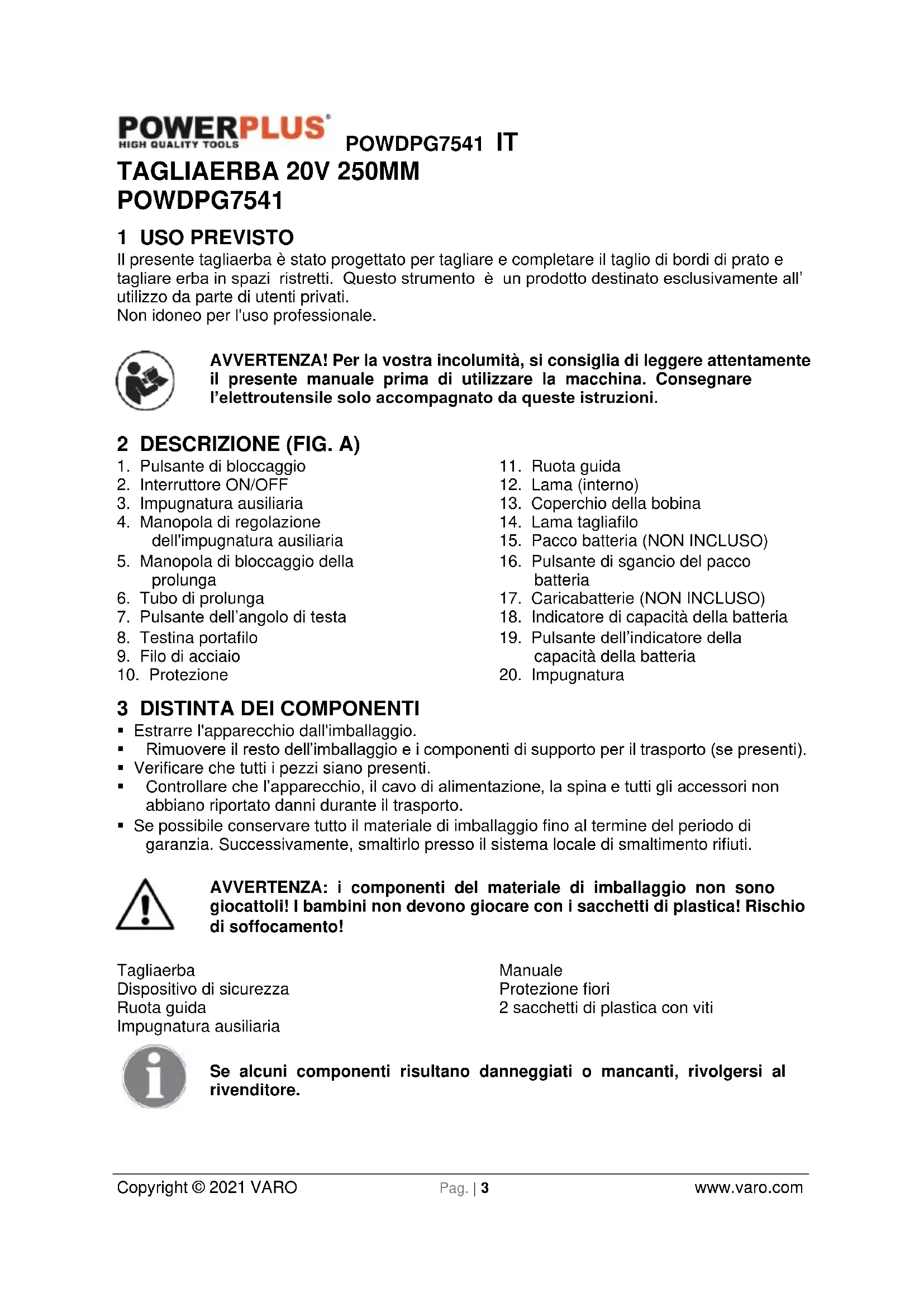 - Non riporre il tagliaerba lasciandolo posato sul pavimento. Appenderlo per l’impugnatura, in modo che la protezione non sia a contatto con alcuna superficie. Il contatto della protezione con una superficie potrebbe alterarne forma e dimensioni, nonché modificarne le caratteristiche di sicurezza. 13 DATI TECNICI Tipo POWDPG7541 Tensione 20V Larghezza di taglio 250 mm Diametro filo Ø1,6 mm Sistema di taglio 1 filo/ automatico Velocità in assenza di carico 8000 /min 14 RUMORE Valori di emissione di rumore misurati in conformità allo standard applicabile. (K=3) Livello di pressione acustica LpA 74 dB(A) Livello di potenza acustica LwA 88 dB(A) ATTENZIONE! Indossare protezioni acustiche se la pressione acustica supera 85 dB(A). aw (Livello di vibrazione) Max. 3,2 m/s² K = 1,5 m/s²POWDPG7541 IT Copyright © 2021 VARO Pag. | 12 www.varo.com 15 GARANZIA