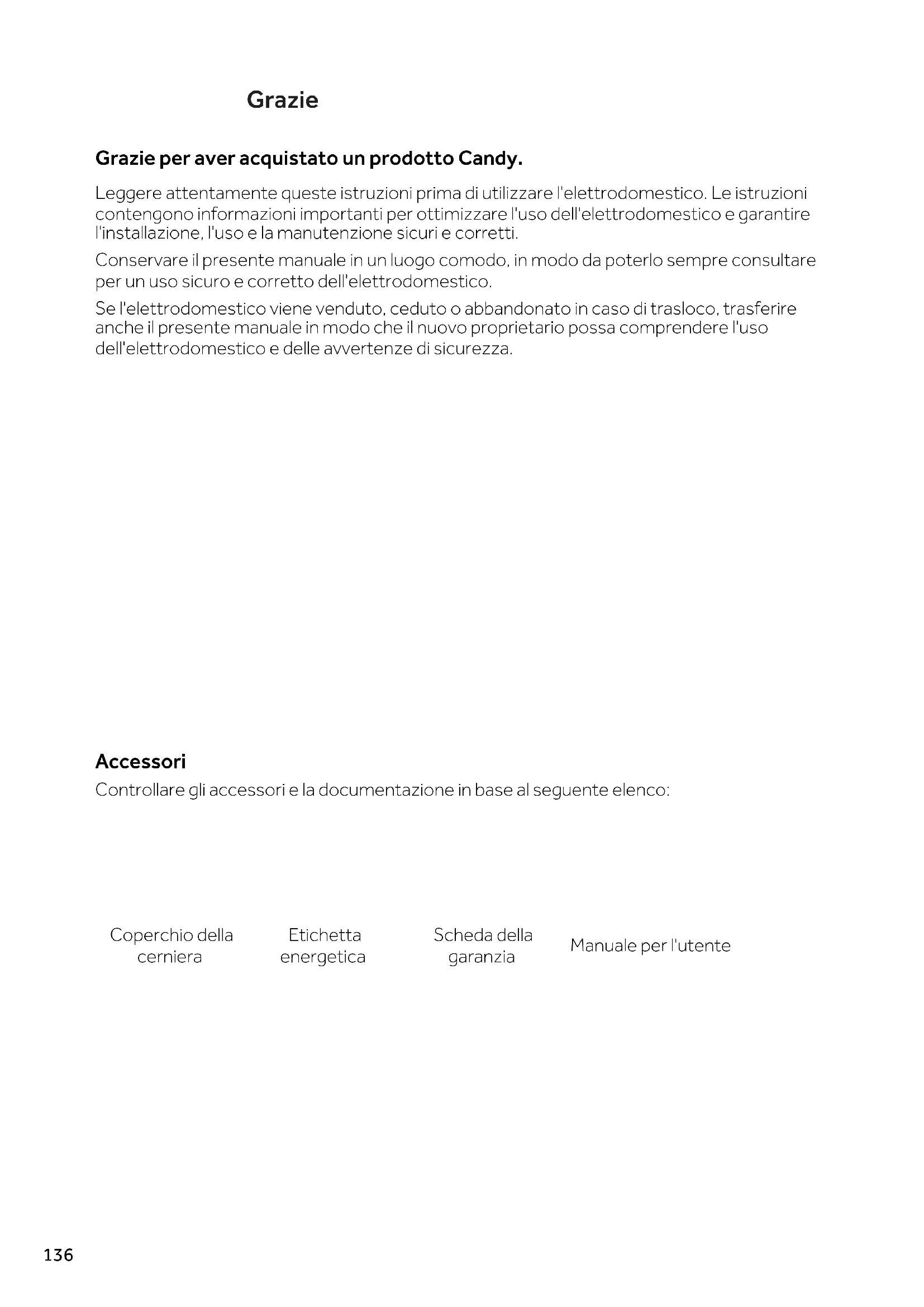Grazie per aver acquistato un prodotto Candy. Leggere attentamente queste istruzioni prima di utilizzare l'elettrodomestico. Le istruzioni contengono informazioni importanti per ottimizzare l'uso dell'elettrodomestico e garantire l'installazione, l'uso e la manutenzione sicuri e corretti. Conservare il presente manuale in un luogo comodo, in modo da poterlo sempre consultare per un uso sicuro e corretto dell'elettrodomestico. Se l'elettrodomestico viene venduto, ceduto o abbandonato in caso di trasloco, trasferire anche il presente manuale in modo che il nuovo proprietario possa comprendere l'uso dell'elettrodomestico e delle avvertenze di sicurezza. Accessori Controllare gli accessori e la documentazione in base al seguente elenco: