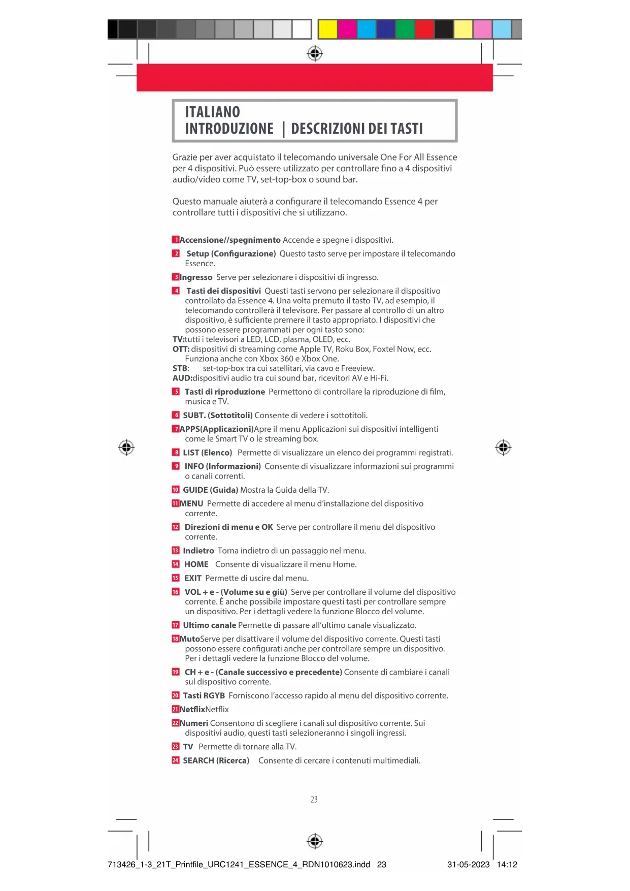 Pulse dos veces el botón que desea restablecer: el LED debe parpadear dos veces y la función programada se habrá eliminado. 713426_1-3_21T_Printfile_URC1241_ESSENCE_4_RDN1010623.indd 22713426_1-3_21T_Printfile_URC1241_ESSENCE_4_RDN1010623.indd 22 31-05-2023 14:1231-05-2023 14:1223 Grazie per aver acquistato il telecomando universale One For All Essence per 4 dispositivi. Può essere utilizzato per controllare no a 4 dispositivi audio/video come TV, set-top-box o sound bar. Questo manuale aiuterà a congurare il telecomando Essence 4 per controllare tutti i dispositivi che si utilizzano. ITALIANO