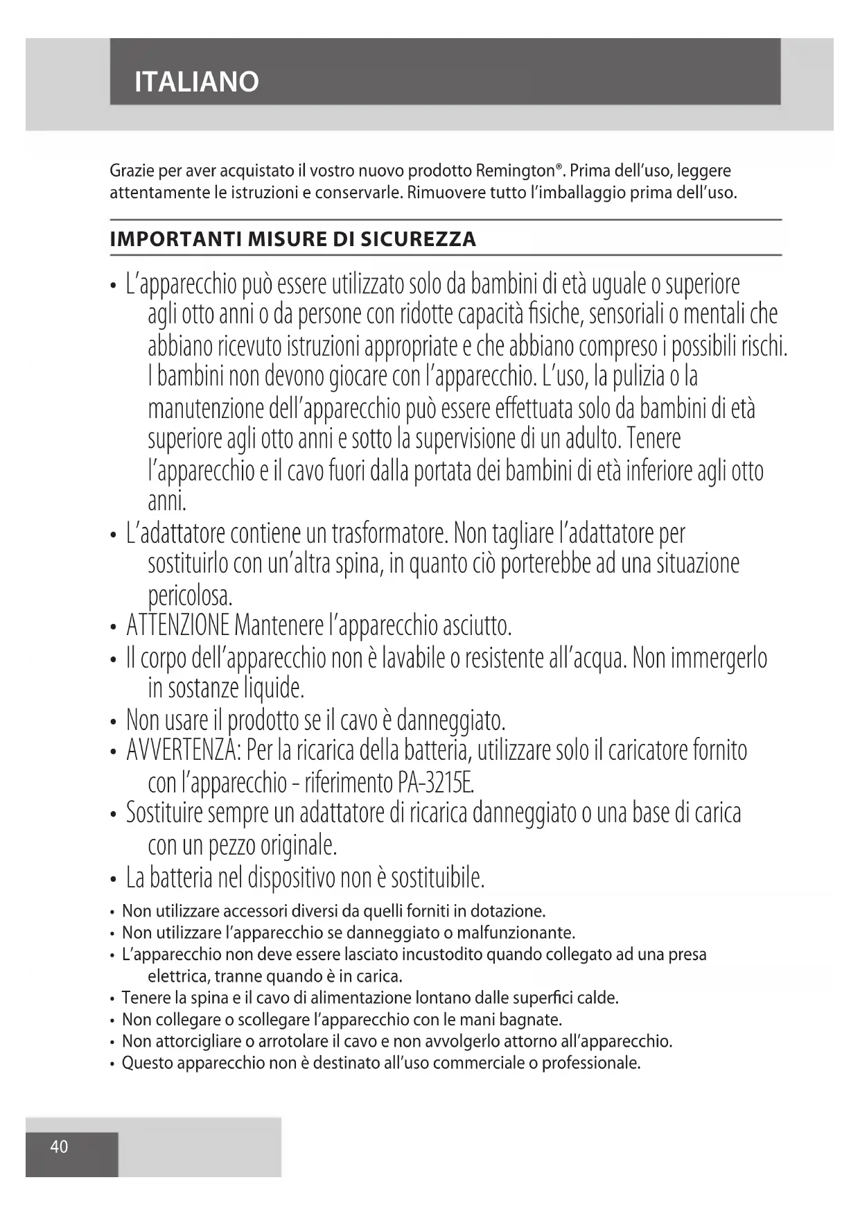 AE40 ITALIANO Grazie per aver acquistato il vostro nuovo prodotto Remington®. Prima dell’uso, leggere attentamente le istruzioni e conservarle. Rimuovere tutto l’imballaggio prima dell’uso.