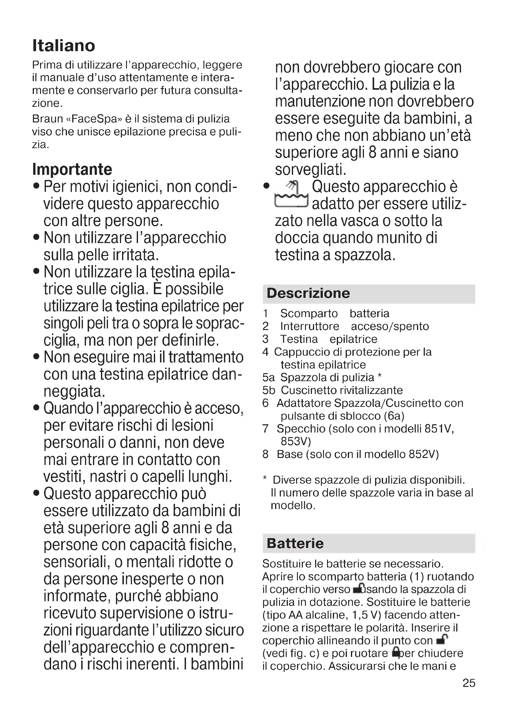 - Diverse spazzole di pulizia disponibili. Il numero delle spazzole varia in base al modello. Batterie Sostituire le batterie se necessario. Aprire lo scomparto batteria (1) ruotando il coperchio verso usando la spazzola di pulizia in dotazione. Sostituire le batterie (tipo AA alcaline, 1,5 V) facendo atten- zione a rispettare le polarità. Inserire il coperchio allineando il punto con (vedi fig. c) e poi ruotare per chiudere il coperchio. Assicurarsi che le mani e 90846664_Velvet_Face_851-853_EMEA_S4-98.indd 2590846664_Velvet_Face_851-853_EMEA_S4-98.indd 25 25.04.16 11:3025.04.16 11:30 CSS APPROVED Effective Date 22Aug2016 GMT - Printed 27Sep2016 Page 25 of 9826 l’apparecchio siano asciutti quando si sostituisce la batteria. Specchio: Rimuovere l’etichetta prima dell’uso. Per sostituire le batterie, aprire lo scomparto batteria (7b) con un cacciavite. Inserire 3 batterie a bottone (tipo LR1130) con i poli + verso l’alto. Riposizionare il coperchio della batteria. Se scariche o non utilizzate a lungo, le batterie possono perdere liquido. Per proteggere se stessi e l’apparecchio, rimuovere le batterie quando necessario ed evitare il contatto con la pelle in pre- senza di batterie che perdono liquido. Le batterie non ricaricabili non vanno ricaricate. Evitare che i terminali di alimentazione facciano cortocircuito. Non usare contemporaneamente batterie nuove e usate, né batterie di tipi differenti. Epilazione del viso