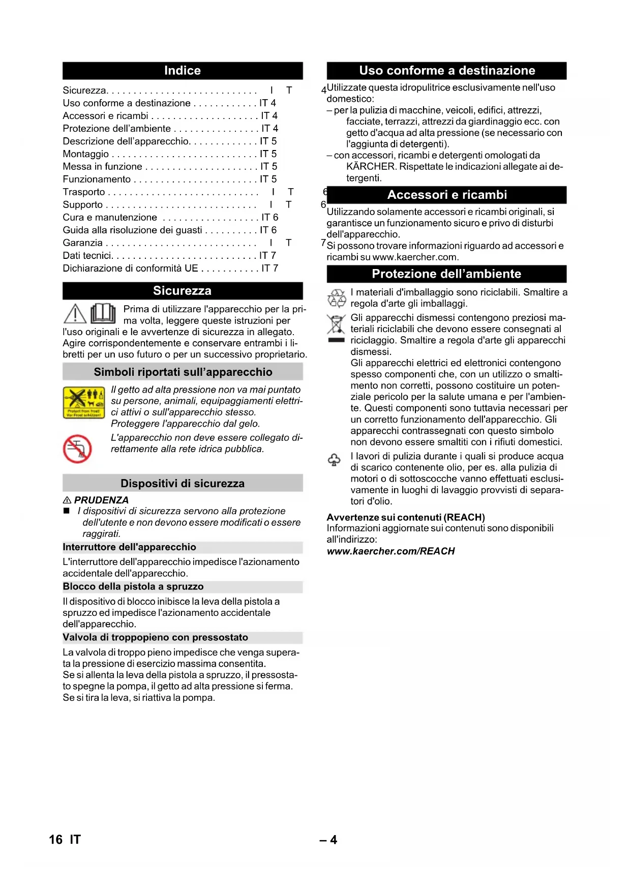91 dB(A) Déclaration UE de conformité Produit : Nettoyeur haute pression Type : 1.600-xxx Directives européennes en vigueur : 2006/42/CE (+2009/127/CE) 2014/30/UE 2011/65/UE 2000/14/CE Normes harmonisées appliquées : EN 60335–1 EN 60335–2–79 EN 62233: 2008 EN 55014–1: 2017 EN 55014–2: 2015 EN 61000–3–2: 2014 EN 61000–3–3: 2013 EN IEC 63000: 2018 Procédures d'évaluation de la conformité 2000/14/CE: Annexe V Niveau de puissance acoustique dB(A) Mesuré: 89 Garanti: 91 Winnenden, 2020/08/01 Chairman of the Board of Management Director Regulatory Affairs & Certification 15FR– 4 Prima di utilizzare l'apparecchio per la pri- ma volta, leggere queste istruzioni per l'uso originali e le avvertenze di sicurezza in allegato. Agire corrispondentemente e conservare entrambi i li- bretti per un uso futuro o per un successivo proprietario. 몇 PRUDENZA I dispositivi di sicurezza servono alla protezione dell'utente e non devono essere modificati o essere raggirati. L'interruttore dell'apparecchio impedisce l'azionamento accidentale dell'apparecchio. Il dispositivo di blocco inibisce la leva della pistola a spruzzo ed impedisce l'azionamento accidentale dell'apparecchio. La valvola di troppo pieno impedisce che venga supera- ta la pressione di esercizio massima consentita. Se si allenta la leva della pistola a spruzzo, il pressosta- to spegne la pompa, il getto ad alta pressione si ferma. Se si tira la leva, si riattiva la pompa. Utilizzate questa idropulitrice esclusivamente nell'uso domestico: – per la pulizia di macchine, veicoli, edifici, attrezzi, facciate, terrazzi, attrezzi da giardinaggio ecc. con getto d'acqua ad alta pressione (se necessario con l'aggiunta di detergenti). – con accessori, ricambi e detergenti omologati da KÄRCHER. Rispettate le indicazioni allegate ai de- tergenti. Utilizzando solamente accessori e ricambi originali, si garantisce un funzionamento sicuro e privo di disturbi dell'apparecchio. Si possono trovare informazioni riguardo ad accessori e ricambi su www.kaercher.com. Avvertenze sui contenuti (REACH) Informazioni aggiornate sui contenuti sono disponibili all'indirizzo: www.kaercher.com/REACH Indice Sicurezza...IT 4 Uso conforme a destinazione ... IT 4 Accessori e ricambi ... IT 4 Protezione dell’ambiente ... IT 4 Descrizione dell’apparecchio... IT 5 Montaggio ... IT 5 Messa in funzione ... IT 5 Funzionamento ... IT 5 Trasporto ...IT 6 Supporto ...IT 6 Cura e manutenzione ... IT 6 Guida alla risoluzione dei guasti ... IT 6 Garanzia ...IT 7 Dati tecnici... IT 7 Dichiarazione di conformità UE ... IT 7 Sicurezza Simboli riportati sull’apparecchio Il getto ad alta pressione non va mai puntato su persone, animali, equipaggiamenti elettri- ci attivi o sull'apparecchio stesso. Proteggere l'apparecchio dal gelo. L'apparecchio non deve essere collegato di- rettamente alla rete idrica pubblica. Dispositivi di sicurezza Interruttore dell'apparecchio Blocco della pistola a spruzzo Valvola di troppopieno con pressostato Uso conforme a destinazione Accessori e ricambi Protezione dell’ambiente I materiali d'imballaggio sono riciclabili. Smaltire a regola d'arte gli imballaggi. Gli apparecchi dismessi contengono preziosi ma- teriali riciclabili che devono essere consegnati al riciclaggio. Smaltire a regola d'arte gli apparecchi dismessi. Gli apparecchi elettrici ed elettronici contengono spesso componenti che, con un utilizzo o smalti- mento non corretti, possono costituire un poten- ziale pericolo per la salute umana e per l'ambien- te. Questi componenti sono tuttavia necessari per un corretto funzionamento dell'apparecchio. Gli apparecchi contrassegnati con questo simbolo non devono essere smaltiti con i rifiuti domestici. I lavori di pulizia durante i quali si produce acqua di scarico contenente olio, per es. alla pulizia di motori o di sottoscocche vanno effettuati esclusi- vamente in luoghi di lavaggio provvisti di separa- tori d'olio. 16 IT– 5 La fornitura del Suo apparecchio è riportata sulla confe- zione. Controllare che il contenuto dell'imballaggio sia completo. In caso di accessori assenti o danni dovuti al trasporto si prega di contattare il rivenditore. Per le figure vedi pagina 2 1 Collegamento dell'acqua con filtro montato 2 Giunto per collegamento dell'acqua 3 Attacco alta pressione 4 Vano accessori 5 Maniglia di trasporto 6 Cavo di allacciamento alla rete con connettore 7 Clip per cavi 8 Custodia per il cavo di allacciamento alla rete 9 Interruttore dell'apparecchio „0/OFF“ / „I/ON“ 10 Pistola a spruzzo 11 Blocco della pistola a spruzzo. 12 Morsetto per tubo flessibile di alta pressione 13 Manicotto di sicurezza 14 Prolunga per lancia 15 Lancia con regolazione della pressione (Vario Power) È possibile aumentare in modo continuo la pressio- ne di lavoro da “SOFT” a “HARD”. Per regolare la pressione di lavoro, rilasciare la leva della pistola ad alta pressione e girare la lancia nella posizione desiderata. 16 Tubo flessibile alta pressione 17 Tubo di alimentazione acqua 18 Giunto per tubo flessibile 19 Giunto per tubo flessibile (Aqua Stop) 20 Raccordo per rubinetti interni Prima della messa in funzione montare i componenti singoli dell'apparecchio. Figure vedi pag. 3 Figura Avvitare il giunto fornito sul collegamento acqua dell'apparecchio. Figura Estrarre il morsetto del tubo flessibile di alta pres- sione dalla pistola a spruzzo. Figura Introdurre il tubo di alta pressione alla pistola a spruzzo. Introdurre il morsetto fino al suo aggancio. Accer- tarsi del corretto aggancio tirando il tubo flessibile di alta pressione. Posizionare l'apparecchio su una superficie piana. Figura Collegare il tubo flessibile alta pressione all'attacco alta pressione dell'apparecchio. Accertarsi del corretto aggancio tirando il tubo fles- sibile di alta pressione. Inserire la spina in una presa elettrica. Valori di collegamento: vedi targhetta e Dati tecnici. Rispettare le disposizioni fornite dalla società per l'ap- provvigion