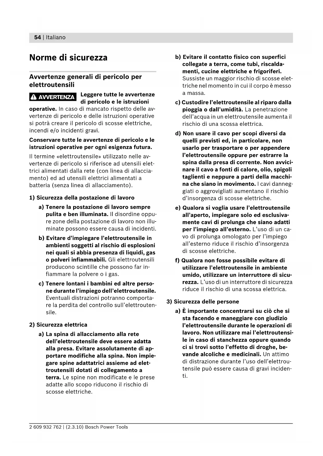 a) È importante concentrarsi su ciò che si sta facendo e maneggiare con giudizio l’elettroutensile durante le operazioni di lavoro. Non utilizzare mai l’elettroutensi- le in caso di stanchezza oppure quando ci si trovi sotto l’effetto di droghe, be- vande alcoliche e medicinali. Un attimo di distrazione durante l’uso dell’elettrou- tensile può essere causa di gravi inciden- ti. AVVERTENZA OBJ_BUCH-824-002.book Page 54 Tuesday, March 2, 2010 9:44 AMItaliano | 55 Bosch Power Tools 2 609 932 762 | (2.3.10) b) Indossare sempre equipaggiamento pro- tettivo individuale nonché occhiali pro- tettivi. Indossando abbigliamento di pro- tezione personale come la maschera per polveri, scarpe di sicurezza che non scivo- lino, elmetto di protezione oppure prote- zione acustica a seconda del tipo e dell’applicazione dell’elettroutensile, si ri- duce il rischio di incidenti. c) Evitare l’accensione involontaria dell’elettroutensile. Prima di collegarlo alla rete di alimentazione elettrica e/o al- la batteria ricaricabile, prima di prender- lo oppure prima di iniziare a trasportar- lo, assicurarsi che l’elettroutensile sia spento. Tenendo il dito sopra l’interrutto- re mentre si trasporta l’elettroutensile op- pure collegandolo all’alimentazione di corrente con l’interruttore inserito, si ven- gono a creare situazioni pericolose in cui possono verificarsi seri incidenti. d) Prima di accendere l’elettroutensile to- gliere gli attrezzi di regolazione o la chia- ve inglese. Un accessorio oppure una chiave che si trovi in una parte rotante della macchina può provocare seri inci- denti. e) Evitare una posizione anomala del cor- po. Avere cura di mettersi in posizione sicura e di mantenere l’equilibrio in ogni situazione. In questo modo è possibile controllare meglio l’elettroutensile in ca- so di situazioni inaspettate. f) Indossare vestiti adeguati. Non indossa- re vestiti larghi, né portare bracciali e ca- tenine. Tenere i capelli, i vestiti ed i guanti lontani da pezzi in movimento. Ve- stiti lenti, gioielli o capelli lunghi potranno impigliarsi in pezzi in movimento. g) In caso fosse previsto il montaggio di di- spositivi di aspirazione della polvere e di raccolta, assicurarsi che gli stessi siano collegati e che vengano utilizzati corret- tamente. L’utilizzo di un’aspirazione pol- vere può ridurre lo svilupparsi di situazio- ni pericolose dovute alla polvere.