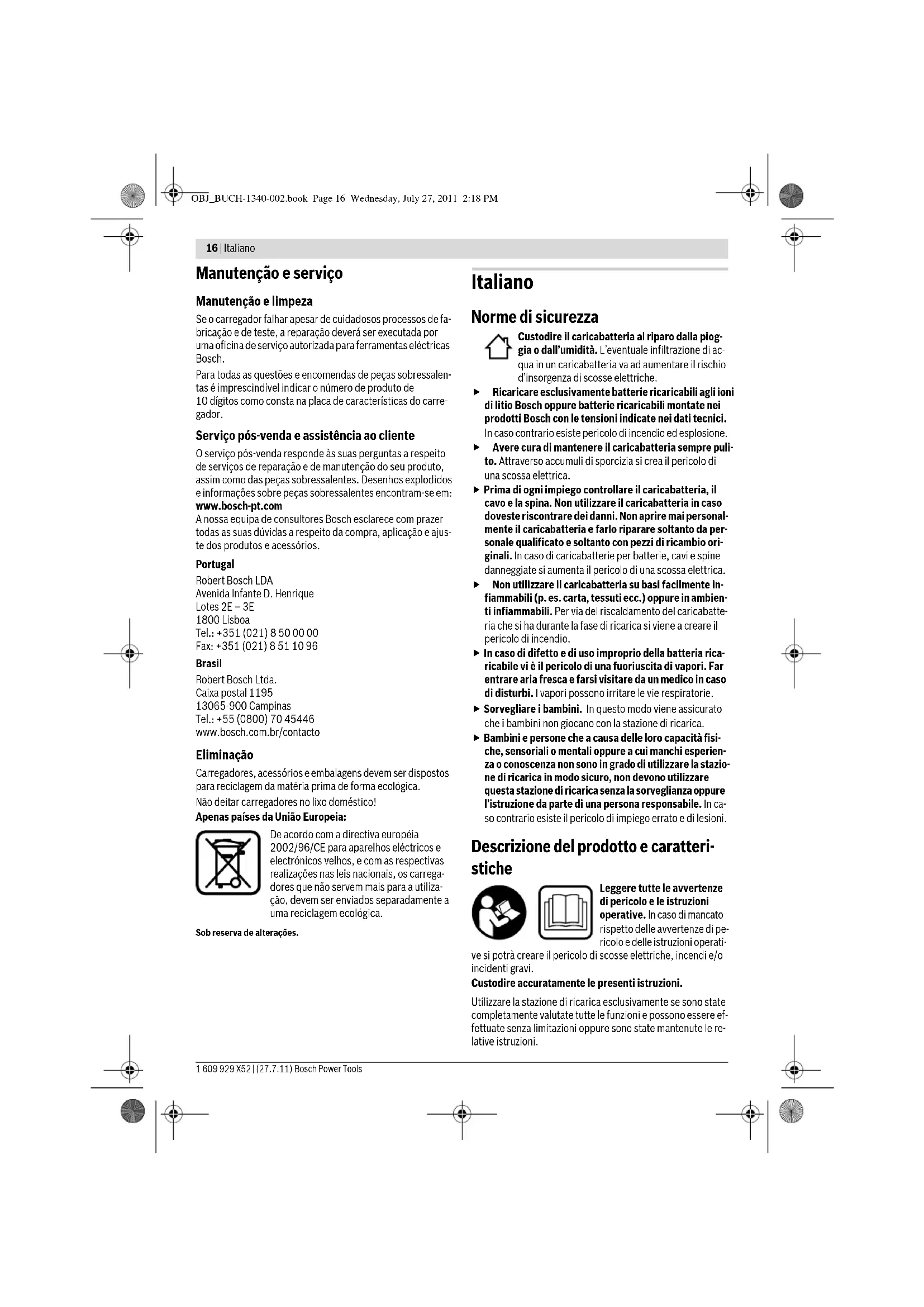Tensão e carga do acumulador V36 Corrente de carga A4,0 Faixa de temperatura de carga admissível °C 0–45 Tempo de carga com capacidade do acumulador, aprox. –1,3 Ah –2,6 Ah –3,0 Ah –4,5 Ah min min min min min min min min 15 (75%) 45 (100%) 30 (75%) 60 (100%) 35 (75%) 75 (100%) 55 (75%) 90 (100%) Número de elementos do acumulador 10 – 30 Peso conforme EPTA-Procedure 01/2003 kg 1,0 Classe de protecção / II Observar o número de produto na placa de características do seu carre-gador. A designação comercial de carregadores individuais pode variar. OBJ_BUCH-1340-002.book Page 14 Wednesday, July 27, 2011 2:18 PMPortuguês | 15 Bosch Power Tools 1 609 929 X52 | (27.7.11) Funcionamento Colocação em funcionamento f Observar a tensão de rede! A tensão da fonte de corrente deve coincidir com a chapa de identificação do carrega- dor. Carregadores marcados para 230 V também podem ser operados com 220 V. Processo de carga O processo de carga começa assim que introduzir a ficha de rede do carregador na tomada e que colocar o acumulador 1 no compartimento de carga 2. Com o processo de carga inteligente, o estado de carga do acumulador é reconhecido automaticamente e o acumulador é carregado de acordo com a temperatura e com a tensão do acumulador, com a corrente de carga ideal. Desta forma o acumulador é poupado e permanece completa- mente carregado, mesmo durante a arrecadação no carregador. Significado dos elementos de indicação Luz verde intermitente de indicação da carga do acumulador 3 O processo de carga rápido é sinalizado pe- lo piscar verde da indicação de carga do acumulador 3. Os três LEDs verdes da indicação de carga 5 do acumulador iluminam-se sequencialmente e apagam-se por instantes duran- te o processo de carga. O acumulador está completamente car- regado, se as três indicações verdes permanecerem iluminadas. Aprox. 5 minutos depois do acumulador estar completamente carregado, apagam-se novamente as três indicações verdes. Nota: O processo de carga rápida só pode ser realizado se a temperatura do acumulador estiver dentro da faixa de tempe- ratura de carga admissível, veja trecho “Dados técnicos”. Luz permanente verde de indicação da carga do acumulador 3 A iluminação permanente verde da indica- ção de carga do acumulador 3 indica, que o acumulador está completamente carregado. Adicionalmente soa durante aprox. 2 segundos um sinal acús- tico, que sinaliza o carregamento completo do acumulador. Em seguida o acumulador pode ser colocado imediatamente em funcionamento. Quando o acumulador não está introduzido, a Luz permanen- te da indicação de carga do acumulador 3 sinaliza que a ficha de rede está introduzida na tomada e que o carregador está pronto para funcionar. Luz permanente vermelha de indicação da carga do acumulador 4 A luz permanente vermelha da indicação de carga do acumulador 4 sinaliza, que a temperatura do acumulador está além da faixa de temperatura de carga admissível, veja capítulo “Dados técnicos”. Assim que a faixa de tempera- tura admissivel for alcançada, o carregador comutar-se-á au- tomaticamente para o carregamento rápido. Se a indicação vermelha para a monitorização da tempera- tura 6 do acumulador se ilumina quando o acumulador é in- troduzido no carregador, significa que a temperatura do acu- mulador se encontra além da temperatura de carga (veja capítulo “Dados técnicos”). O acumulador só pode ser carre- gado ao ser alcançada a faixa de temperatura admissível. Luz intermitente vermelha de indicação da carga do acu- mulador 4 A luz intermitente vermelha da indicação de carga do acumulador 4 sinaliza uma ou- tra avaria do processo de carga, veja capítu- lo “Avaria – Causas e acções correctivas”. Avaria – Causas e acções correctivas Indicações de trabalho No caso de contínuos e repetidos ciclos de carga, sem inter- rupção, é possível que o carregador se esquente. Isto no en- tanto não tem importância e não apresenta qualquer defeito técnico do carregador. Um período de funcionamento reduzido após o carregamen- to, indica que o acumulador está gasto e que deve ser substi- tuido. Arrefecimento do acumulador (Active Air Cooling) O comando do ventilador integrado no carregador controla a temperatura do acumulador introduzido. Se a temperatura do acumulador estiver acima de 30 °C, o acumulador será arre- fecido por um ventilador até alcançar a temperatura ideal de carga. O ventilador ligado produz um ruído de ventilação. Se o ventilador não estiver funcionando, significa que a tem- peratura do acumulador se incontra na faixa de temperatura de carga ideal ou que o ventilador está com defeito. Neste ca- so o período de carga do acumulador é prolongado. Causa Solução Indicação vermelha da carga do acumulador 4 pisca Nenhum processo de carga possível O acumulador não foi (correc- tamente) colocado Colocar o acumulador correc- tamente no carregador Contactos do acumulador su- jos Limpar os contactos do acu- mulador, p. ex. colocando e retirando repetidamente o acumulador, se necessário substituir o acumulador Acumulador com defeito Substituir o acumulador As indicações de carga do acumulador 3 ou 4 não se ilu- minam A ficha de rede do carregador não está (correctamente) in- troduzida Introduzir a ficha de rede (to- talmente) na tomada Tomada, cabo de rede ou car- regador com defeito Controlar a tensão de rede, se necessário, permitir que o carregador seja controlado por uma oficina de serviço au- torizada para ferramentas eléctricas Bosch OBJ_BUCH-1340-002.book Page 15 Wednesday, July 27, 2011 2:18 PM16 | Italiano 1 609 929 X52 | (27.7.11) Bosch Power Tools Manutenção e serviço Manutenção e limpeza Se o carregador falhar apesar de cuidadosos processos de fa- bricação e de teste, a reparação deverá ser executada por uma oficina de serviço autorizada para ferramentas eléctricas Bosch. Para todas as quest