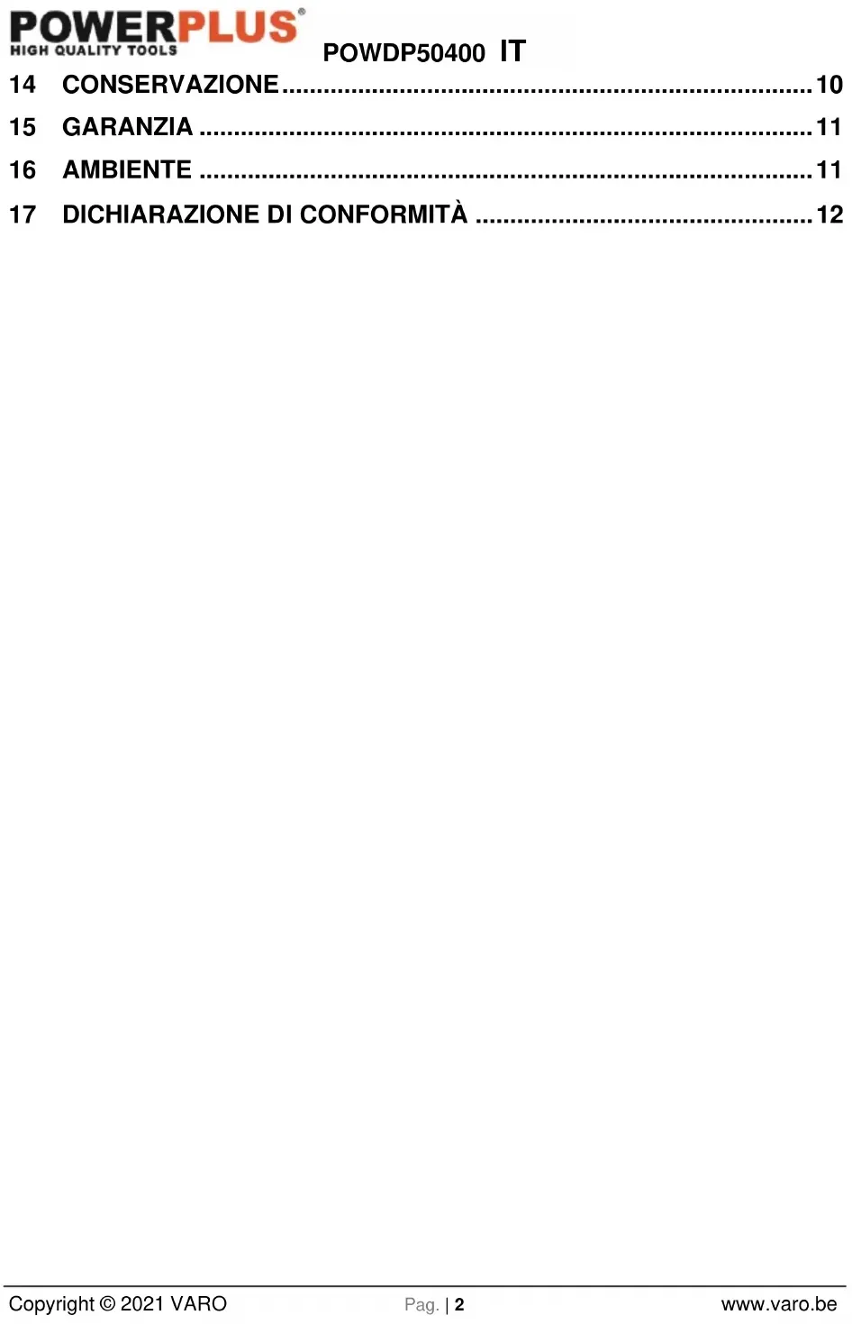 Con la presente, VARO – Vic. Van Rompuy N.V. – Joseph Van Instraat 9 – B2500 Lier, Belgio, dichiara che Descrizione dell’apparecchio: Levigatrice eccentrica 20 V – Alimentata a batteria Marchio: PowerPlus Numero articolo: POWDP50400 è conforme ai requisiti essenziali e alle altre disposizioni pertinenti stabilite dalle Direttive Europee in base all’applicazione delle norme europee armonizzate. Qualsiasi modifica effettuata sul prodotto rende nulla questa dichiarazione. Direttive europee (inclusi eventuali emendamenti fino alla data della firma): 2011/65/EU 2006/42/EC 2014/30/EU Norme europee armonizzate (inclusi eventuali emendamenti fino alla data della firma): EN62841-1 : 2015 EN62841-2-4 : 2014 EN55014-1 : 2017 EN55014-2 : 2015 Depositario della documentazione tecnica: Philippe Vankerkhove, VARO – Vic. Van Rompuy N.V. Il sottoscritto agisce in nome e per conto del CEO della società, Ludo Mertens Certification Manager 11/06/2021, Lier - BelgiumPOWDP50400 PT Copyright © 2021 VARO Página | 1 www.varo.be 1 APLICAÇÃO ......................................................................................... 3