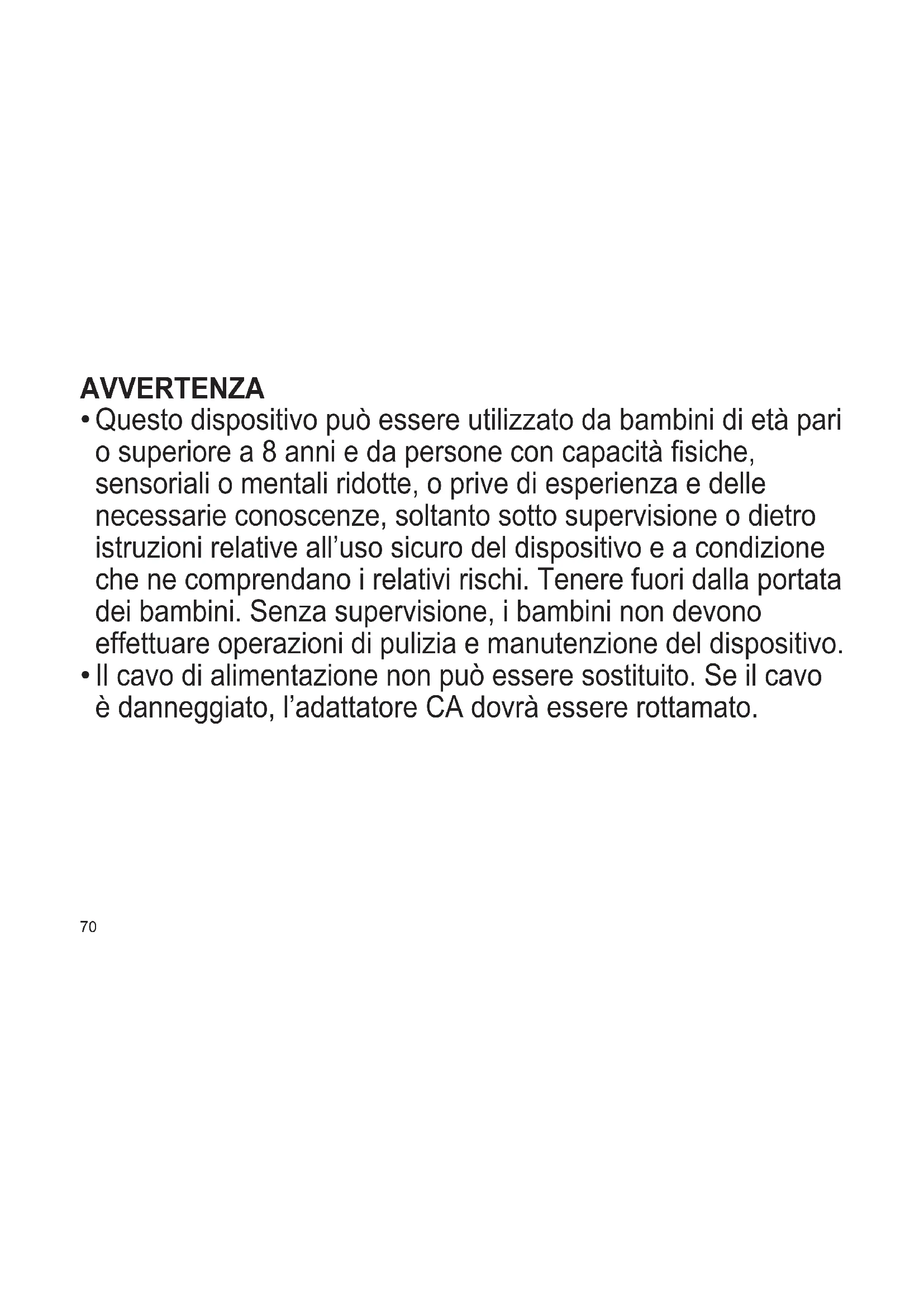 Questo dispositivo può essere utilizzato da bambini di età pari o superiore a 8 anni e da persone con capacità siche, sensoriali o mentali ridotte, o prive di esperienza e delle necessarie conoscenze, soltanto sotto supervisione o dietro istruzioni relative all’uso sicuro del dispositivo e a condizione che ne comprendano i relativi rischi. Tenere fuori dalla portata dei bambini. Senza supervisione, i bambini non devono effettuare operazioni di pulizia e manutenzione del dispositivo.