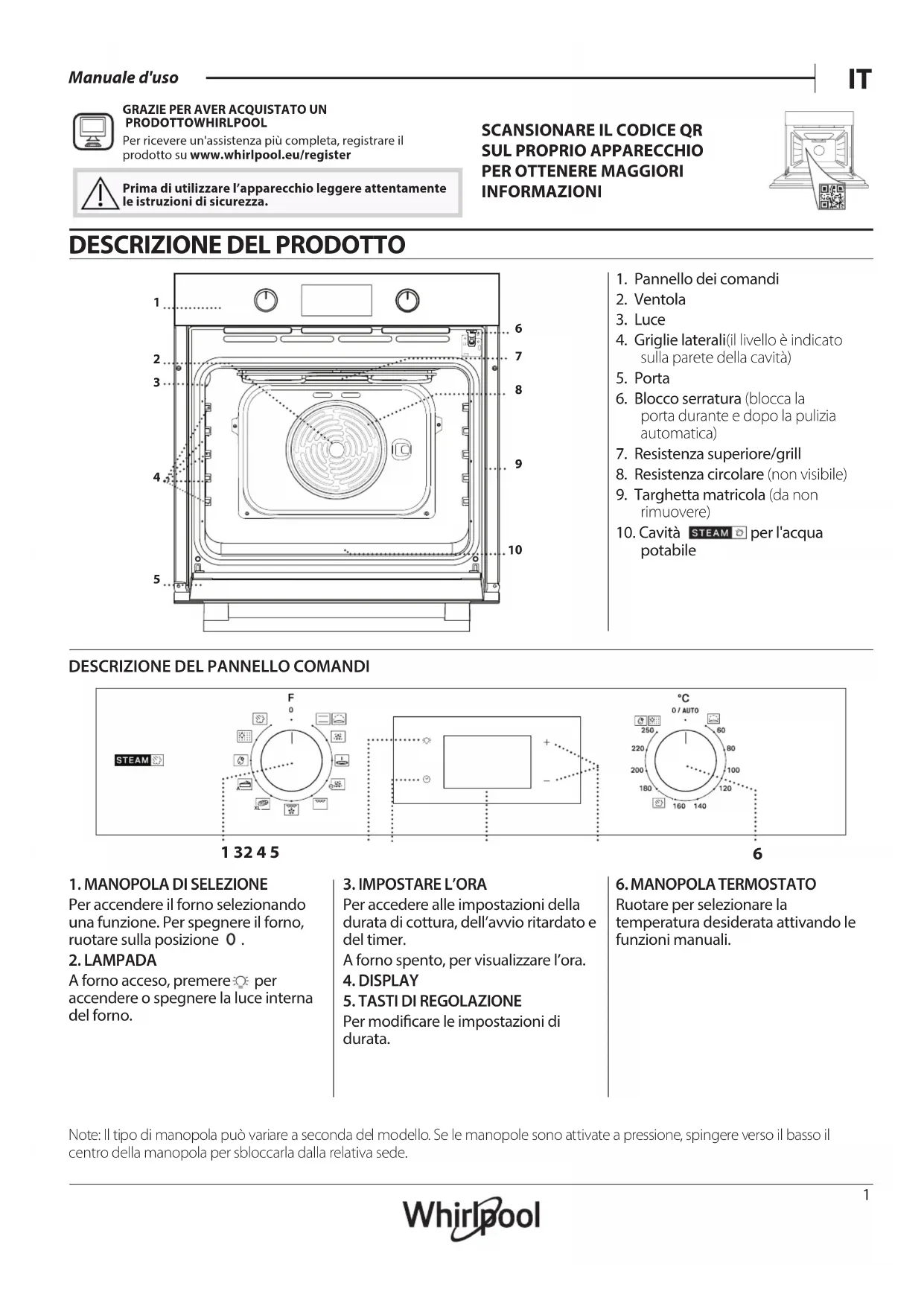 Manuale d'uso GRAZIE PER AVER ACQUISTATO UN PRODOTTOWHIRLPOOLPer ricevere un'assistenza più completa, registrare il prodotto su www . whirlpool . eu/ register