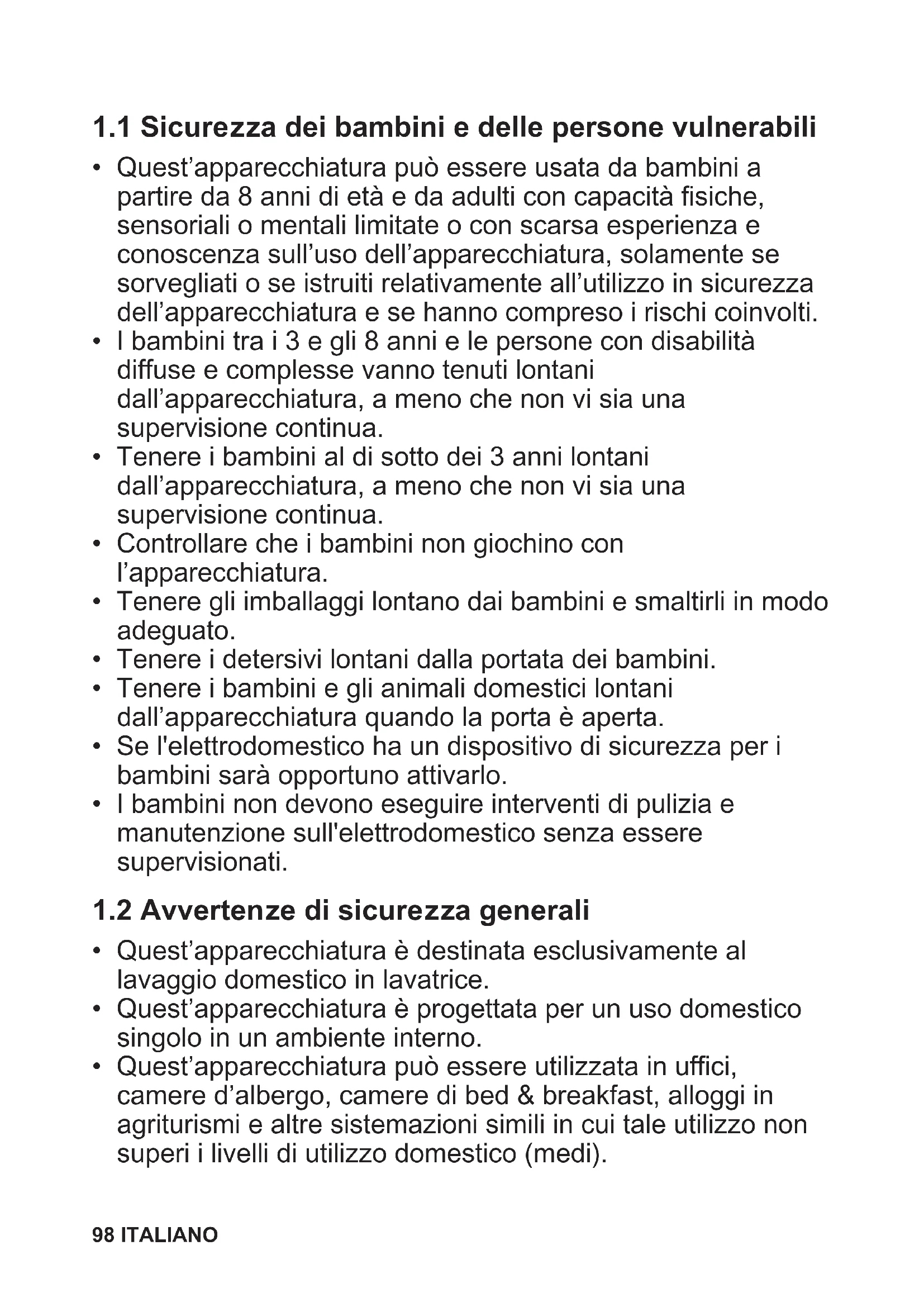 Prima di iniziare, leggere attentamente le istruzioni fornite prima di installare e utilizzare l’apparecchiatura. I produttori non sono responsabili di eventuali lesioni o danni derivanti da un’installazione o un uso scorretti. Conservare sempre le istruzioni in un luogo sicuro e accessibile per poterle consultare in futuro. ITALIANO 971.1 Sicurezza dei bambini e delle persone vulnerabili
