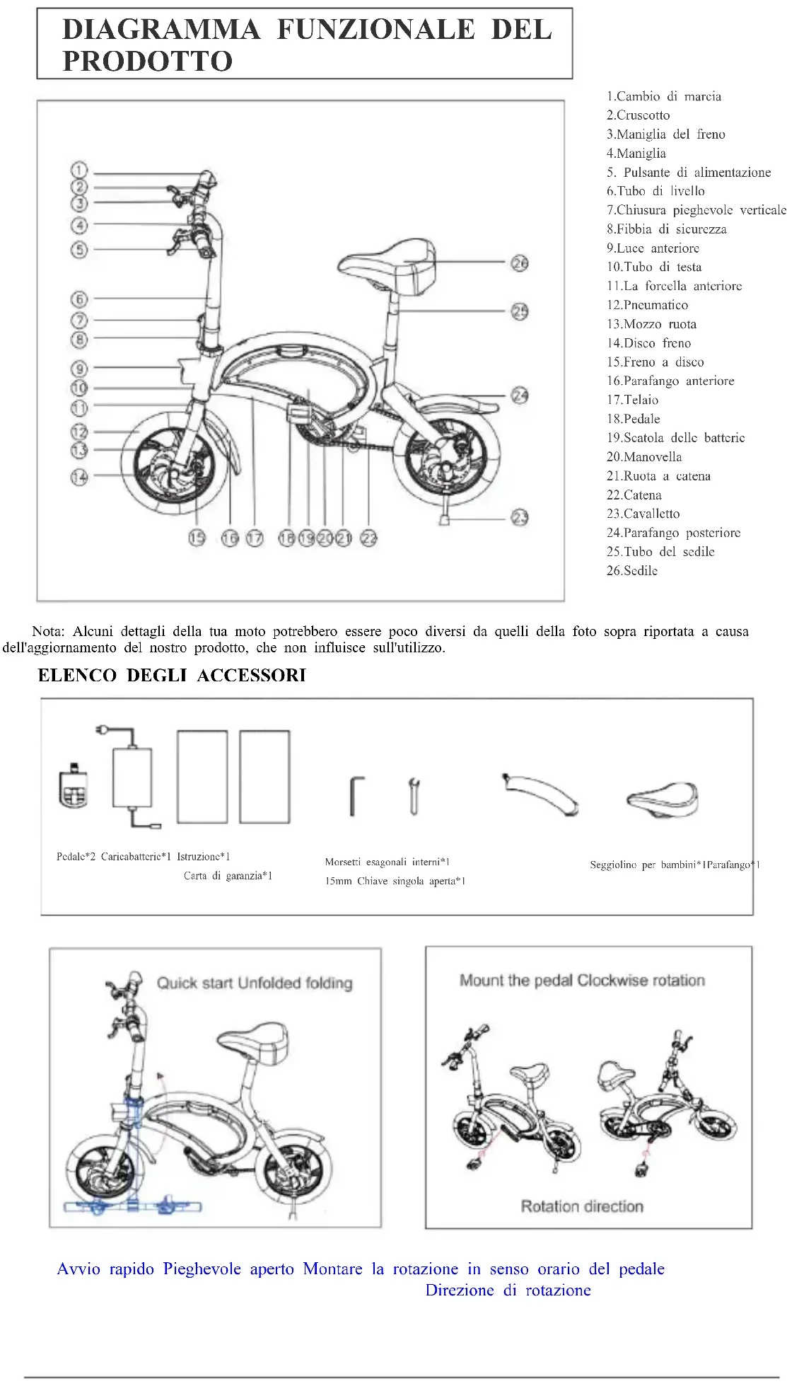 6.Tubo di livello 7.Chiusura pieghevole verticale 8.Fibbia di sicurezza 9.Luce anteriore 10.Tubo di testa 11.La forcella anteriore 12.Pneumatico 13.Mozzo ruota 14.Disco freno 15.Freno a disco 16.Parafango anteriore 17.Telaio 18.Pedale 19.Scatola delle batterie 20.Manovella 21.Ruota a catena 22.Catena 23.Cavalletto 24.Parafango posteriore 25.Tubo del sedile 26.Sedile Nota: Alcuni dettagli della tua moto potrebbero essere poco diversi da quelli della foto sopra riportata a causa dell'aggiornamento del nostro prodotto, che non influisce sull'utilizzo.