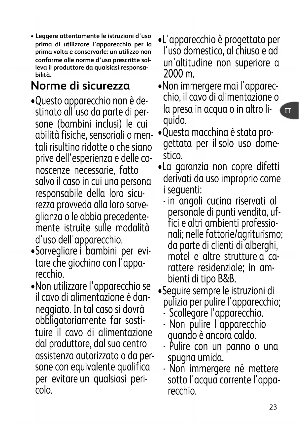- Leggere attentamente le istruzioni d’uso prima di utilizzare l’apparecchio per la prima volta e conservarle: un utilizzo non conforme alle norme d’uso prescritte sol- leva il produttore da qualsiasi responsa- bilità. Norme di sicurezza