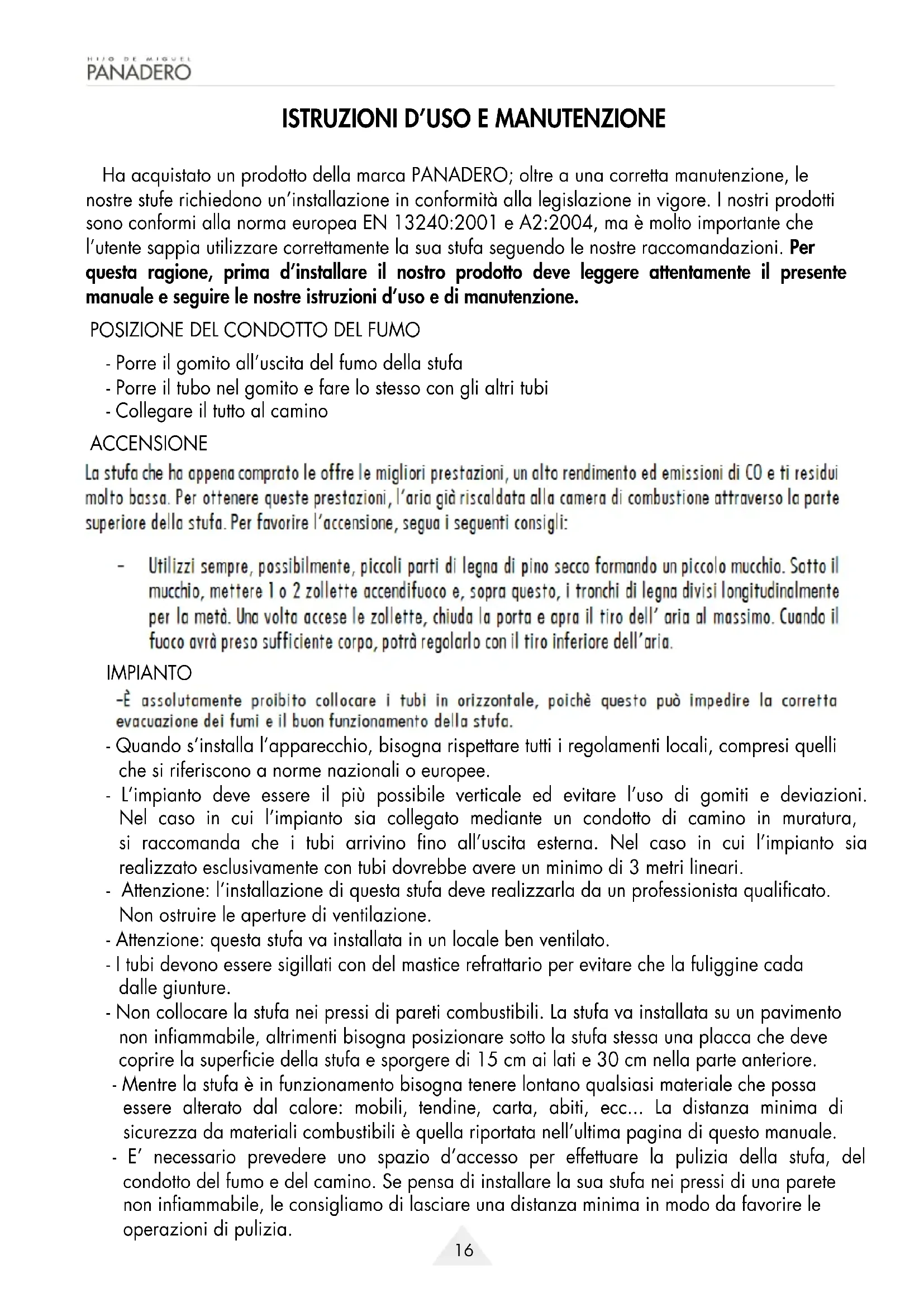 Ha acquistato un prodotto della marca PANADERO; oltre a una corretta manutenzione, le nostre stufe richiedono un’installazione in conformità alla legislazione in vigore. I nostri prodotti sono conformi alla norma europea EN 13240:2001 e A2:2004, ma è molto importante che l’utente sappia utilizzare correttamente la sua stufa seguendo le nostre raccomandazioni. Per questa ragione, prima d’installare il nostro prodotto deve leggere attentamente il presente manuale e seguire le nostre istruzioni d’uso e di manutenzione.