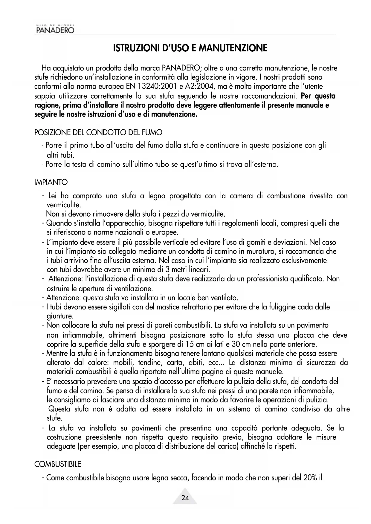 Ha acquistato un prodotto della marca PANADERO; oltre a una corretta manutenzione, le nostre stufe richiedono un’installazione in conformità alla legislazione in vigore. I nostri prodotti sono conformi alla norma europea EN 13240:2001 e A2:2004, ma è molto importante che l’utente sappia utilizzare correttamente la sua stufa seguendo le nostre raccomandazioni. Per questa ragione, prima d’installare il nostro prodotto deve leggere attentamente il presente manuale e seguire le nostre istruzioni d’uso e di manutenzione.