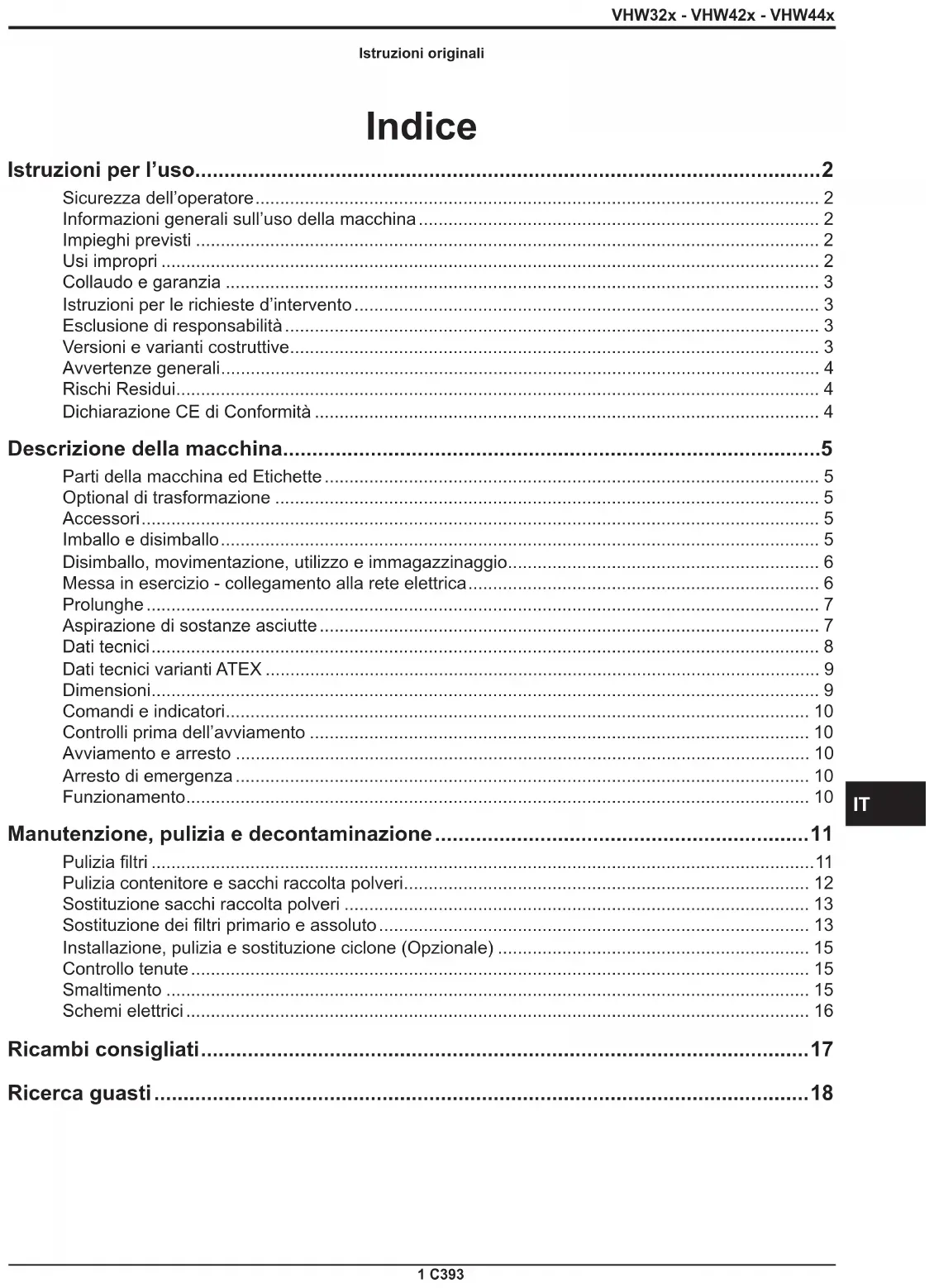 Ricerca guasti Inconveniente Causa Rimedio La macchina non parte Mancanza di corrente Vericare se c’è corrente alla presa. Vericare se la spina ed il cavo sono integri. Richiedere l’assistenza di un tecnico del fabbricante, abilitato. La macchina aumenta di giri Filtro primario intasato Azionare lo scuotiltro (per modelli con scuotiltro manuale). Se non è suciente, sostituirlo. Tubo di aspirazione intasato Controllare il condotto di aspirazione e pulirlo. Perdita di polvere dalla macchina Il ltro si è lacerato Sostituirlo con un altro di identica categoria. Il ltro non è adeguato Sostituirlo con altro di categoria idonea e vericare. L’aspiratore si è arrestato improvvisamentei Intervento del salvamotore Controllare la regolazione. Controllare l’assorbimento del motore. Se necessario, rivolgersi ad un centro di assistenza autorizzato. L’aspiratore anziché aspirare soa Non corretto allacciamento alla rete elettrica Richiedere l’intervento del personale specializzato per eettuare il corretto collegamento delle fasi. Presenza di correnti elettrostatiche sulla macchina Mancata o ineciente messa a terra Vericare tutte le messe a terra. In particolare il raccordo al bocchettone di aspirazione; inoltre sostituire il tubo con uno antistatico.VHW32x - VHW42x - VHW44x 17 C393